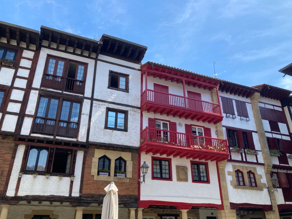 La place est magnifique car elle est composée de maisons à balcons rouges, bleus, verts et marron foncé.