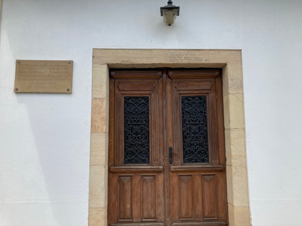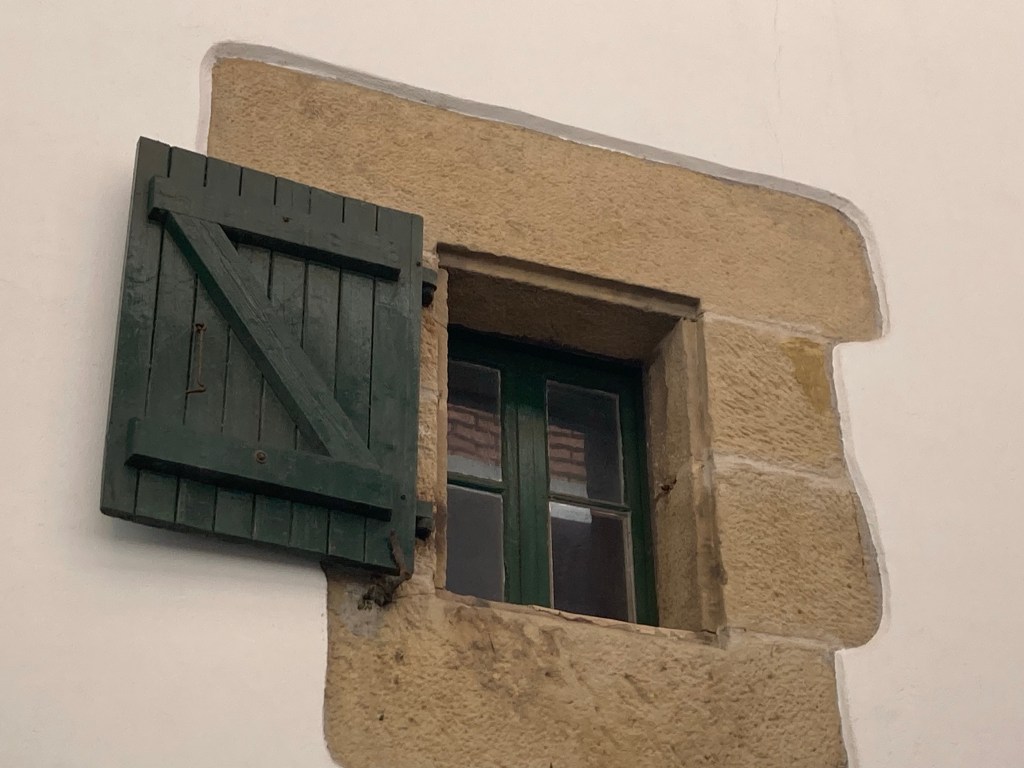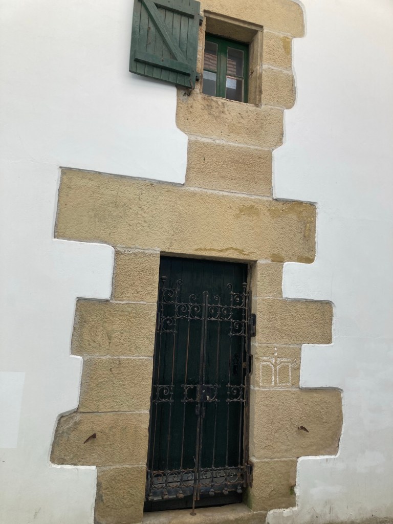 Une très belle maison au mur couleur de chaud blanche et de très belle pierre avec des portes aux grilles travaillées et des petites fenêtres carrées avec des volets de même taille.