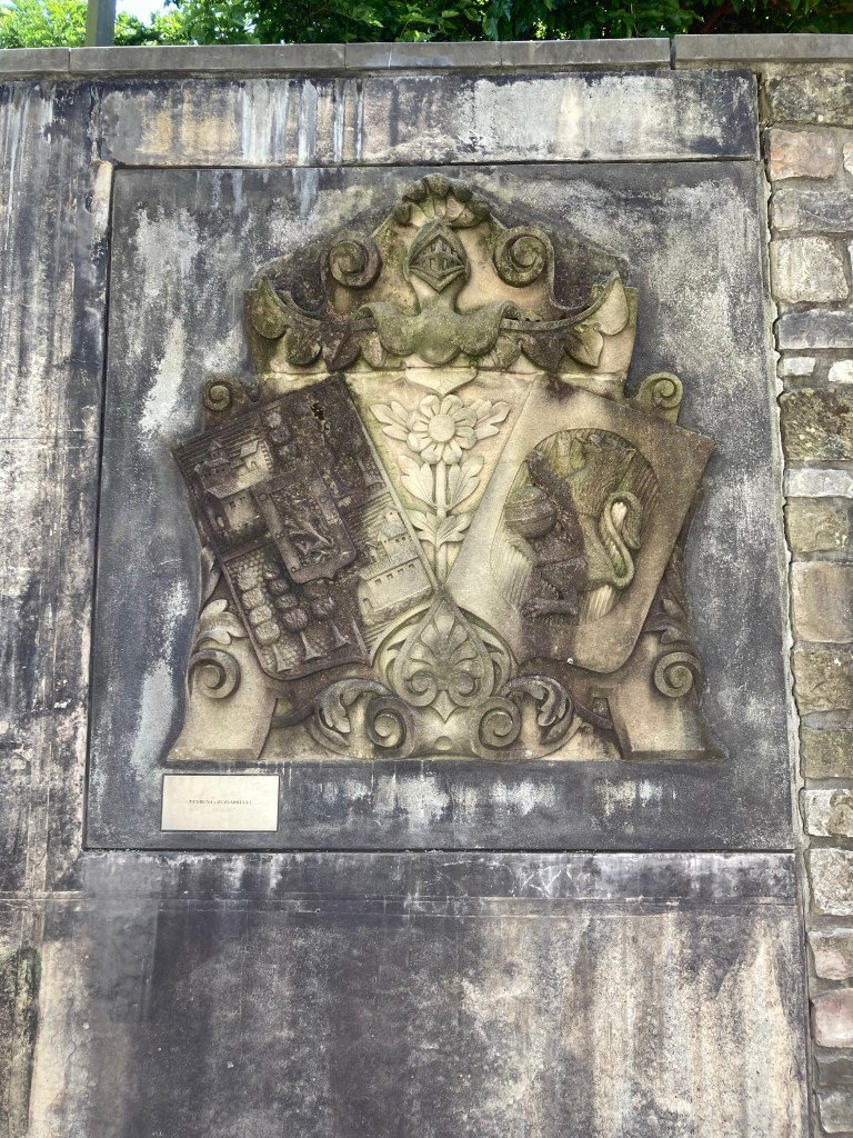 Plus loin un joli mur avec un fronton composé d’un casque de fer, de fleurs, d’un loup ou d’un fauve et de l’autre côté un blason avec la représentation de la ville et d’arbres aux fruits ronds.
