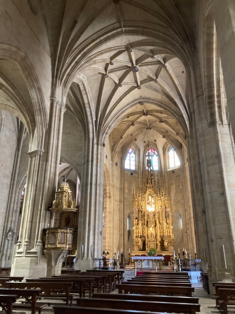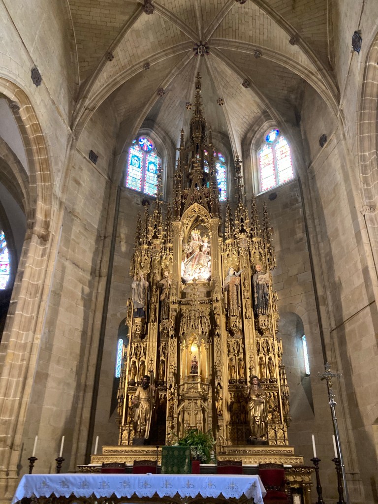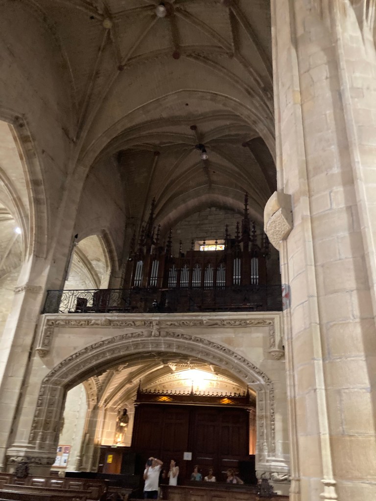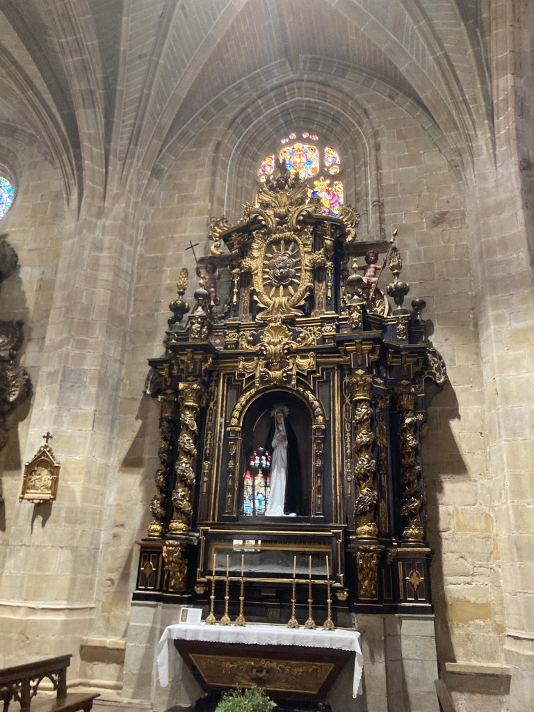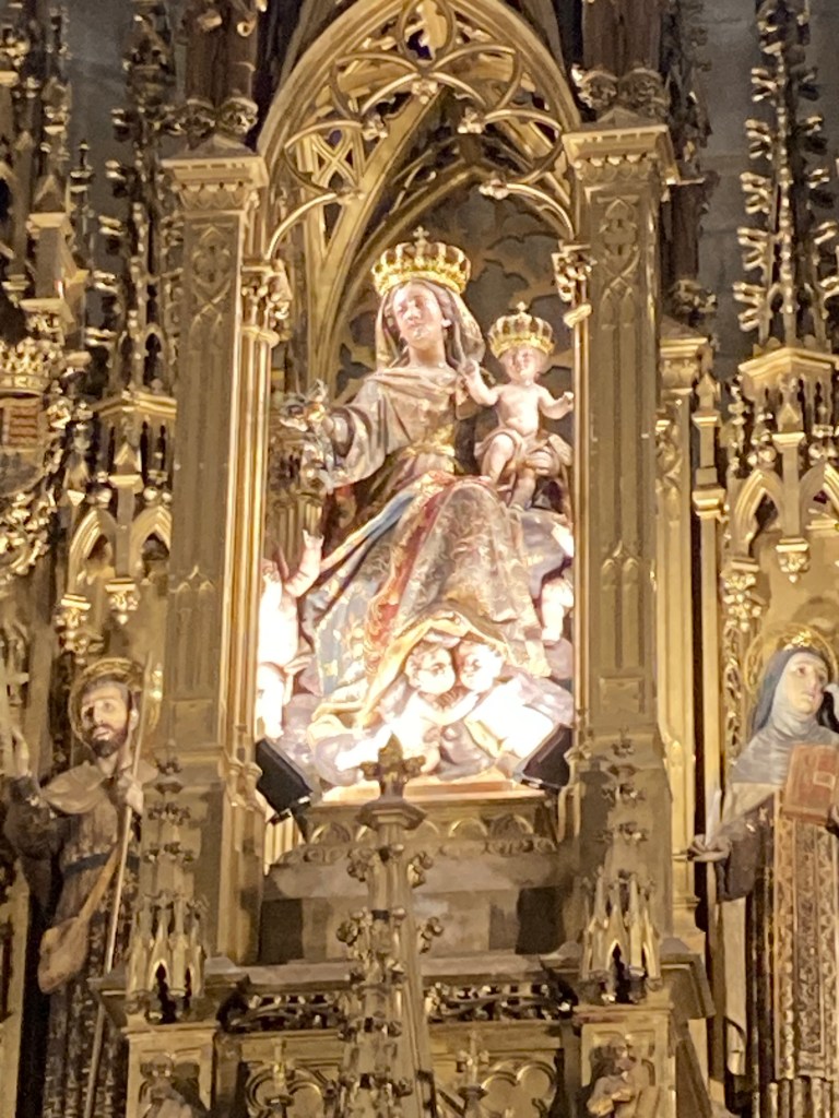 Entrant dans la cathédrale j’ai été impressionnée par la hauteur de la cathédrale et surtout au niveau de l’autel par la très belle vierge à l’enfant dans un encadrement en or. On comprend mieux la richesse de l’Espagne à travers les autels en or, les magnifiques escaliers avec des rampes en fer forgé, différents autels en bois et or ainsi que l’orgue qui trône au-dessus de la porte d’entrée.