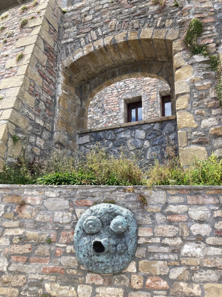 Continuant mon chemin j’ai longé le château fort et j’ai découvert en son verso une drôle de tête en cuivre vert avec des yeux ronds et une bouche ouverte qui devait cracher quelque chose mais en fait qui marquait juste son étonnement !