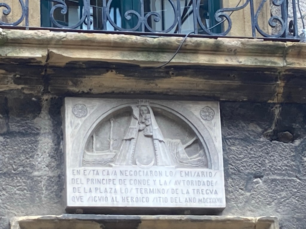 Une jolie pierre qui représente une femme avec une robe longue et une couronne décrit que c’est dans ce lieu que les émissaires du Prince de Condé ont négocié la reddition de la France en 1638.