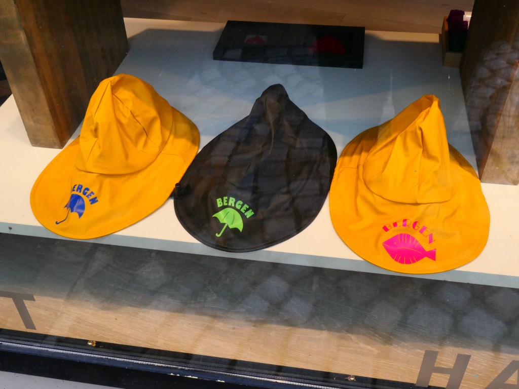 Les chapeaux de pluie aussi aux couleurs violentes mais qui se repèrent de loin, qui protège les oreilles du froid mordant et de la pluie et vous enrobe parfaitement. Je les avais découverts aux iles Lofoten et j’en avais rapporté à tous mes amis !