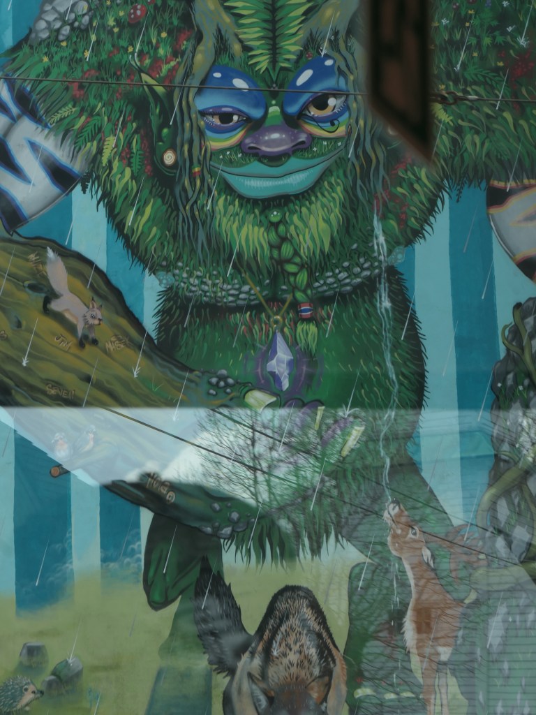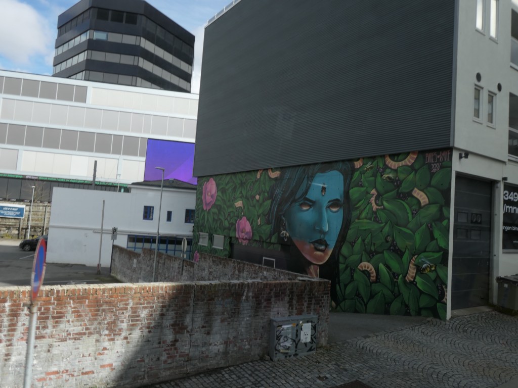 Et ces deux grandes fresques dans un quartier neuf de Bergen avec ce visage bleu comme sorti du film Avatar dans un monde de feuilles vertes. Et tout proche ce zombi aux cheveux roses et au visage géométrique de différentes couleurs dont le cou peut ressembler à un clocher d’église. Le tout orné de fleurs sur un fond bleu ciel.