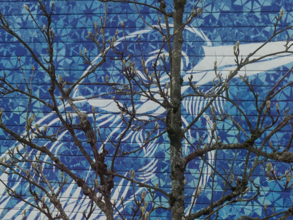 Encore un oiseau sur fond bleu plus foncé dont le bec blanc se détache, caché derrière un arbre dénudé, sans fleurs.
