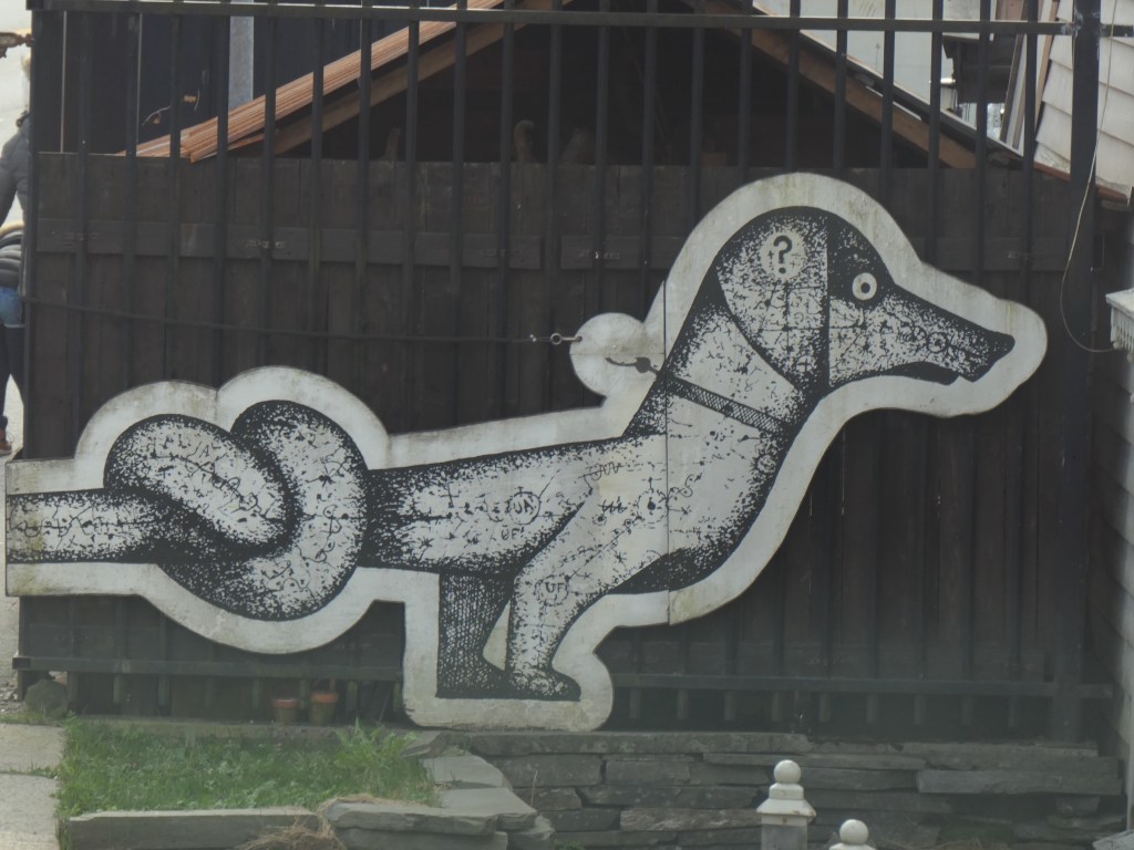 Puis ce chien noir sur un mur en bois et le V en rouge qui ne dit pas si c’est le collier du chien ou bien le fait qu’il soit attaché !