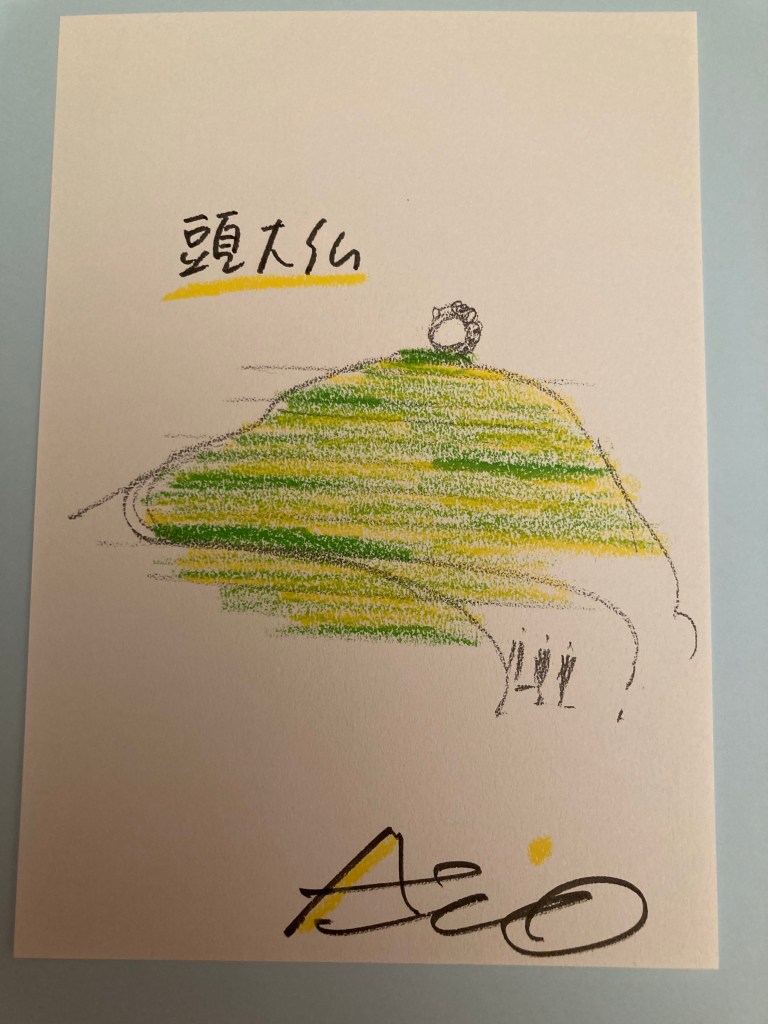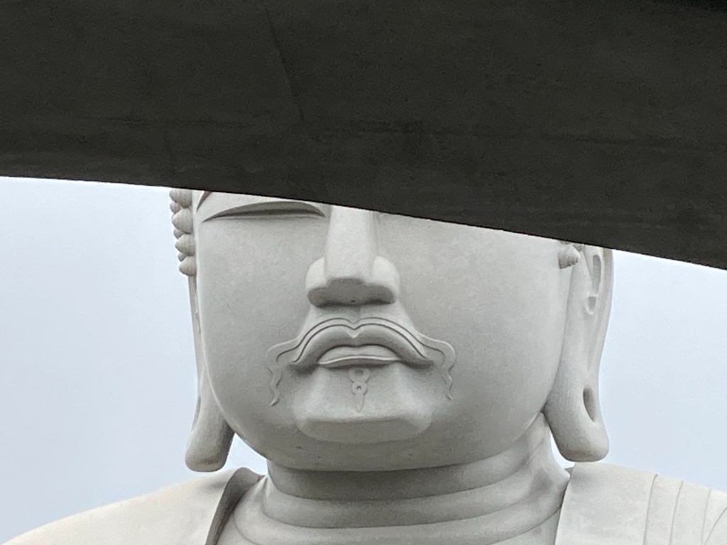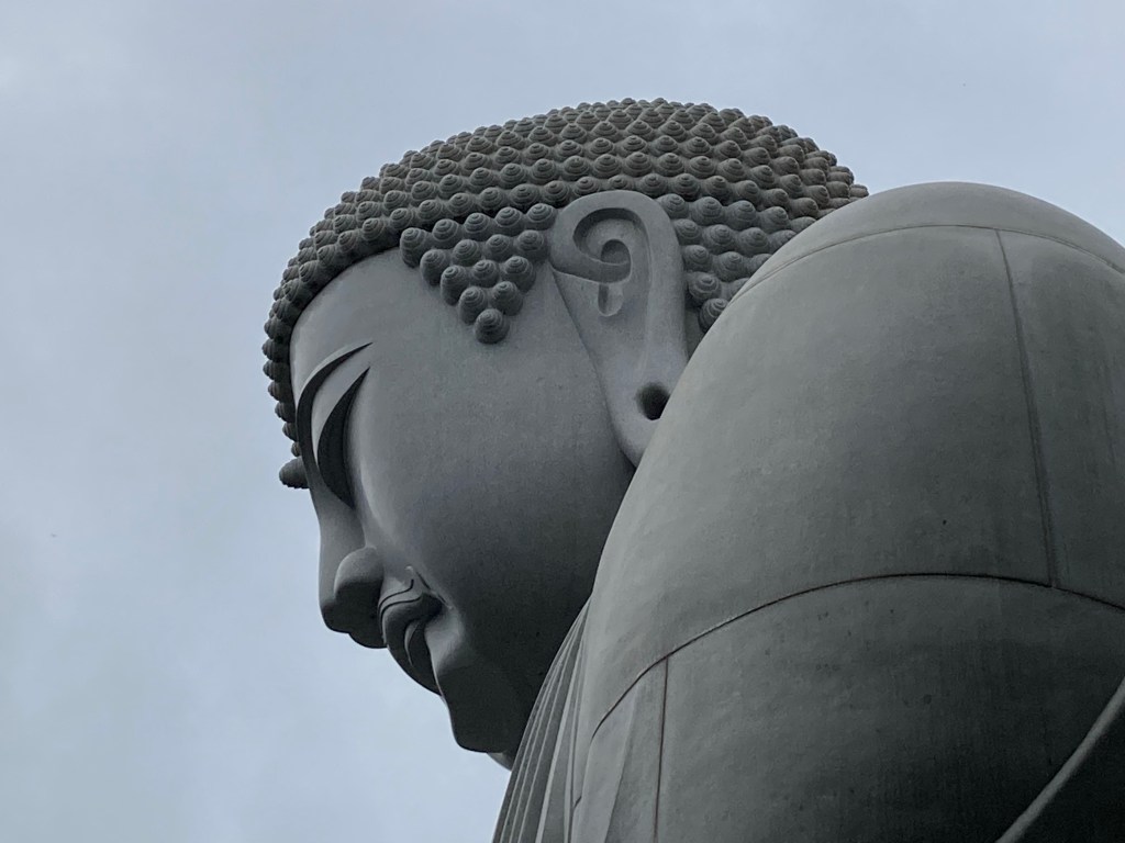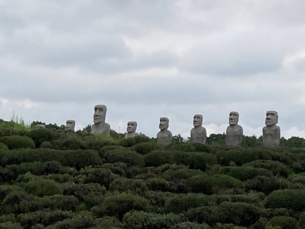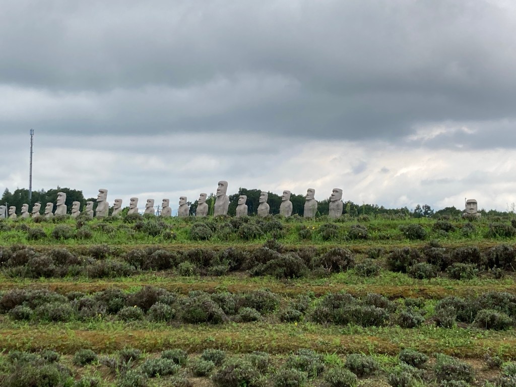 « Ce qui est invisible stimule l’imagination » ! Et c’est bien ce qui se passe lorsque l’on arrive de Sapporo par la route et que l’on découvre, en entrant sur le site ces trente-trois Moaîs, les uns à côté des autres, qui vous accompagnent sur le chemin vers Bouddha. Une rangée d’hommes, de géants droits qui vous saluent et rendent hommage. On se croirait sur l’île de Pâques. Et j’ai trouvé touchant cet oiseau sur la tête du Moaï.