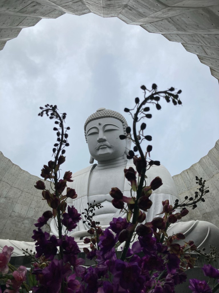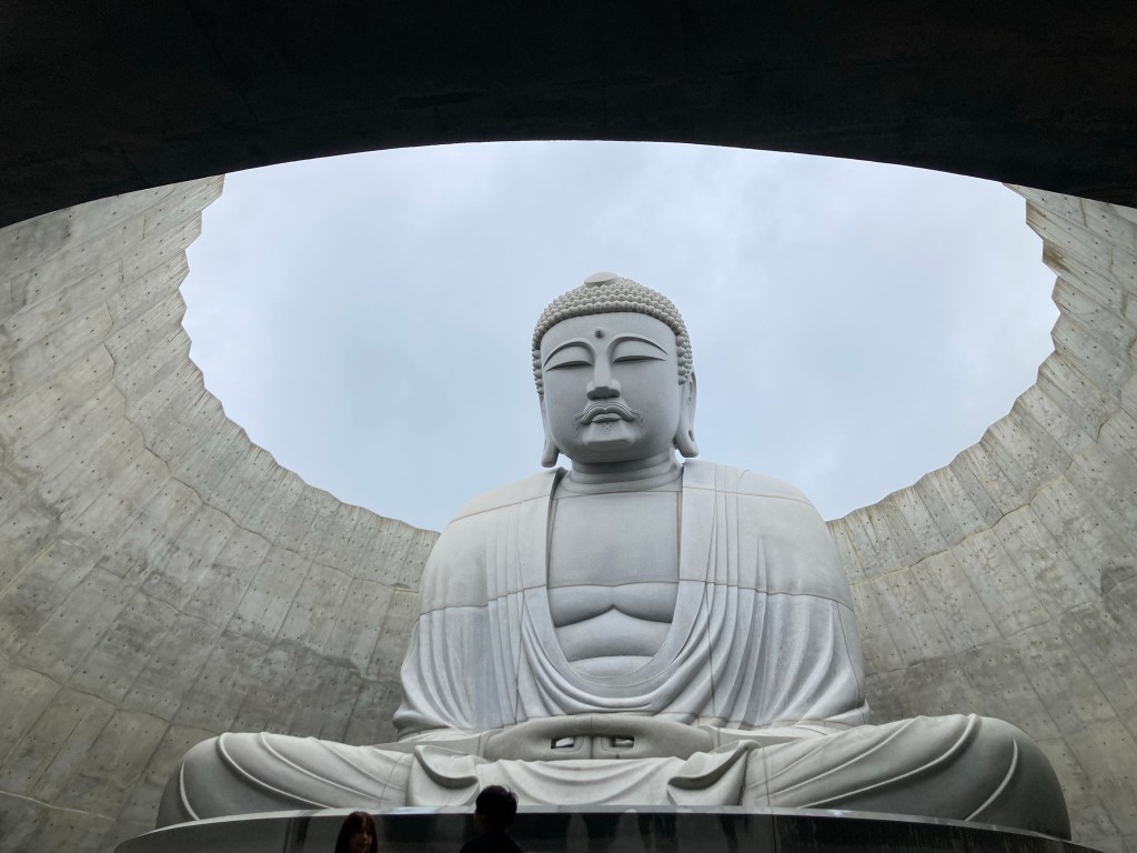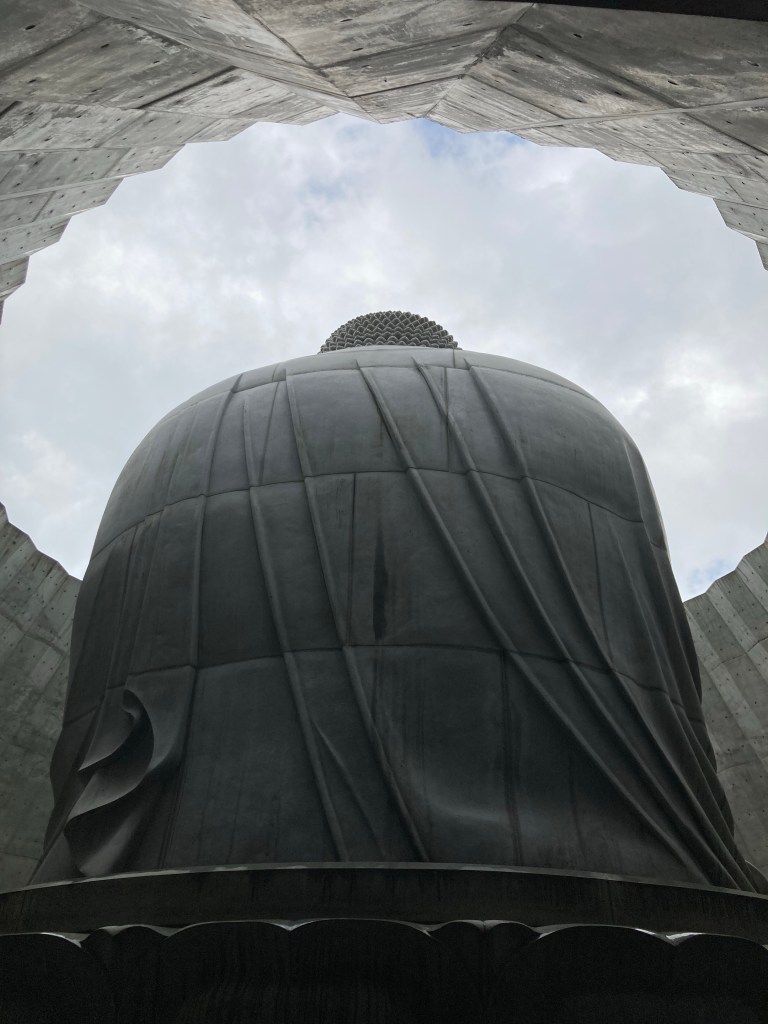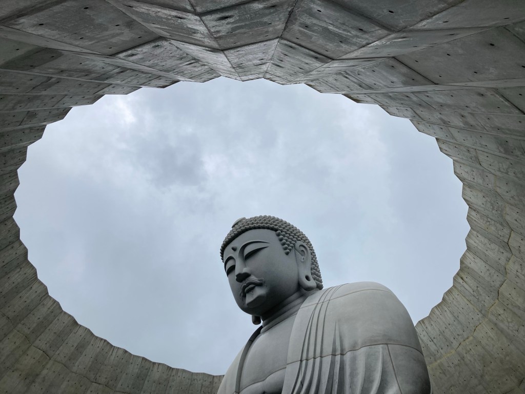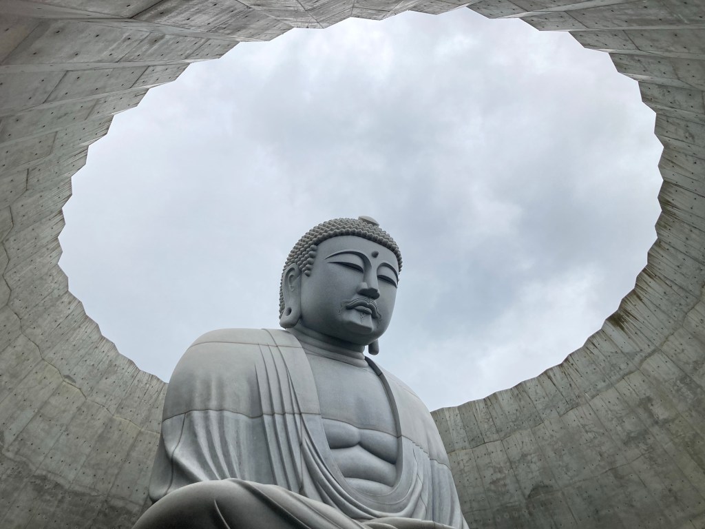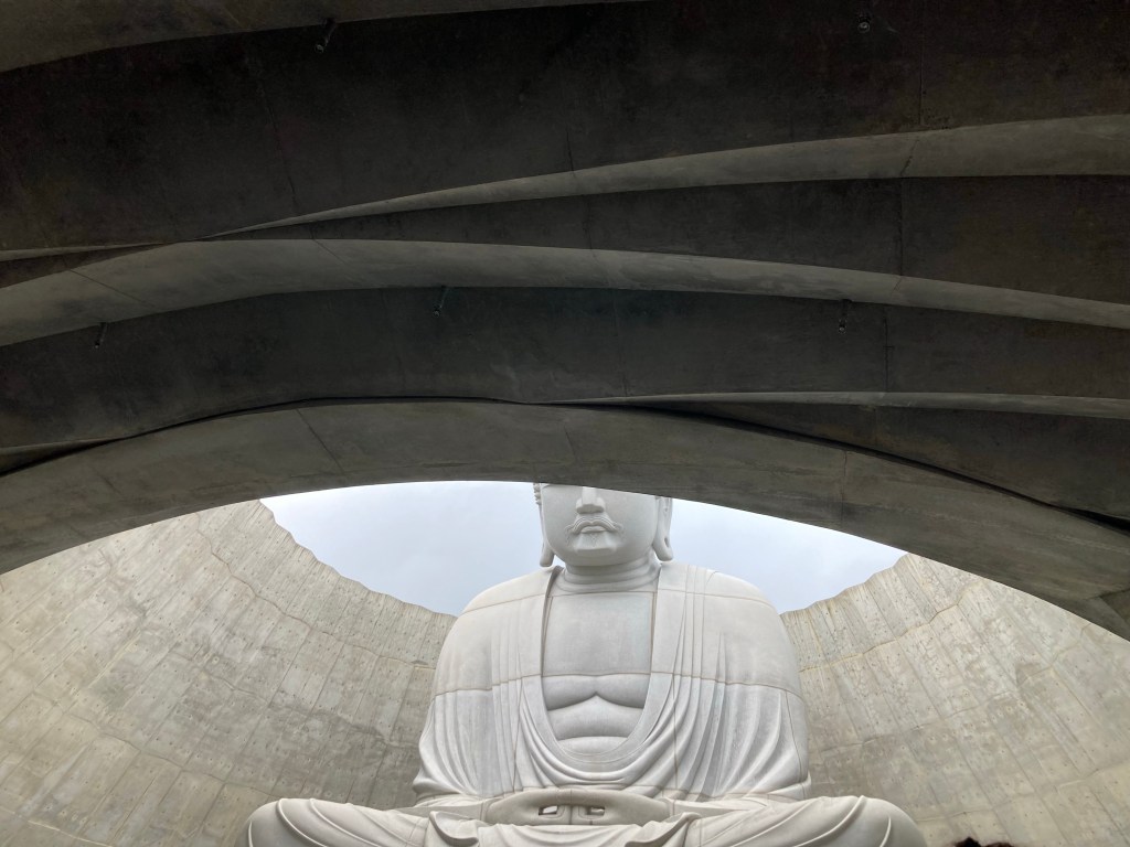 Et vous passez sous un long portique, sorte de tunnel de 40 mètres formant des arcs pour enfin atteindre Bouddha en position de lotus. Une auréole de ciel surplombe son visage. Il est la représentation du Spirituel, du repos et de l’émerveillement au sens bouddhiste du terme.