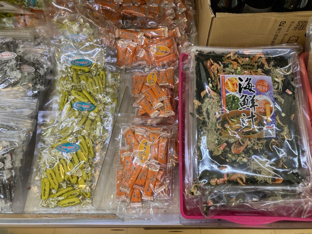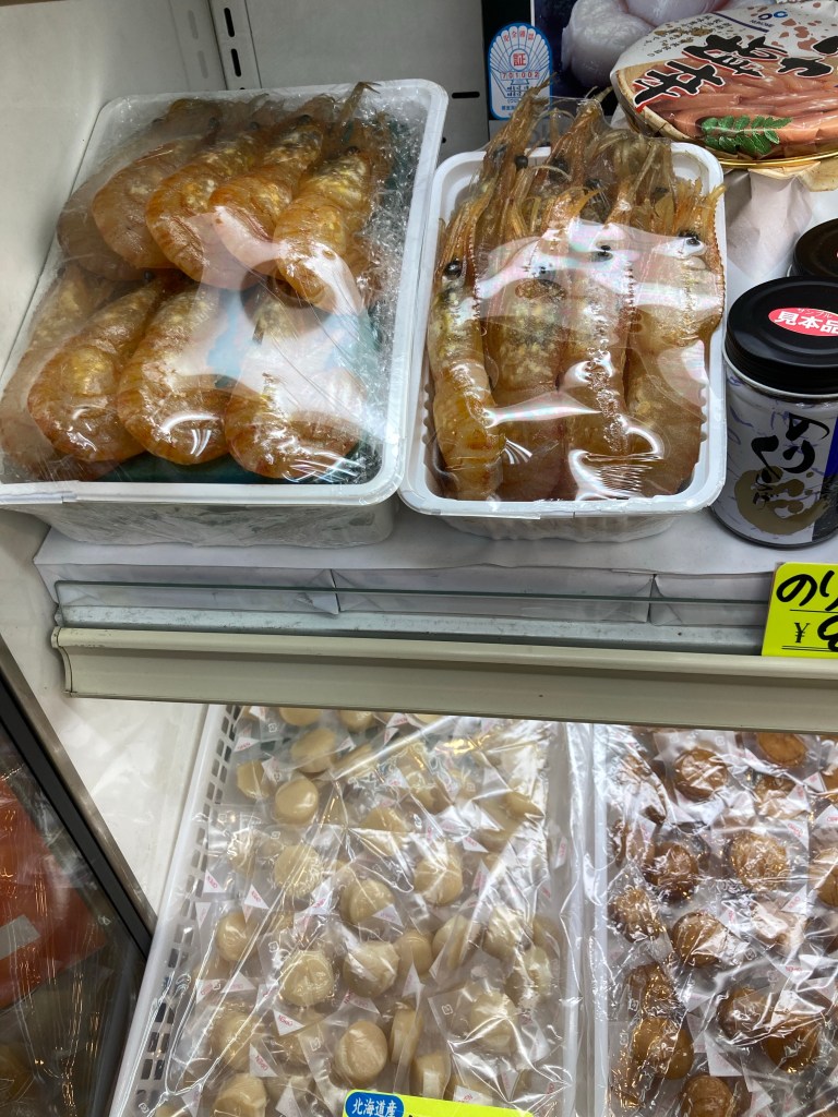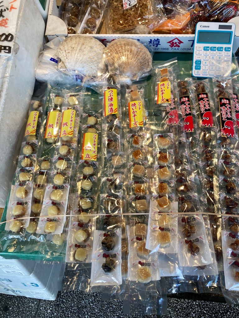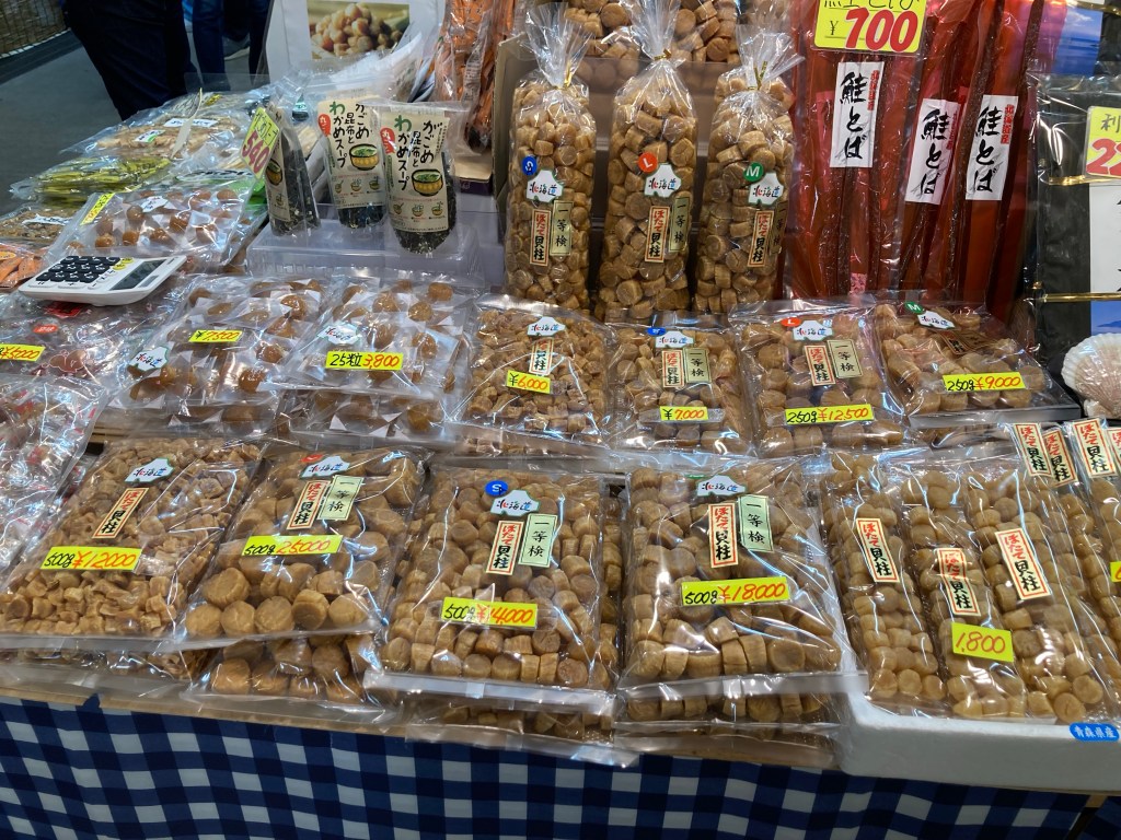 Des noix de coquilles saint Jacques séchées sous vide en grosse poche ou bien enveloppées une par une par dizaine (ne pas me demander comment on utilise le produit) et aussi fraiches que j’ai goutée (cela manquait de poivre et épices – les Japonais mangent peu épicé !)