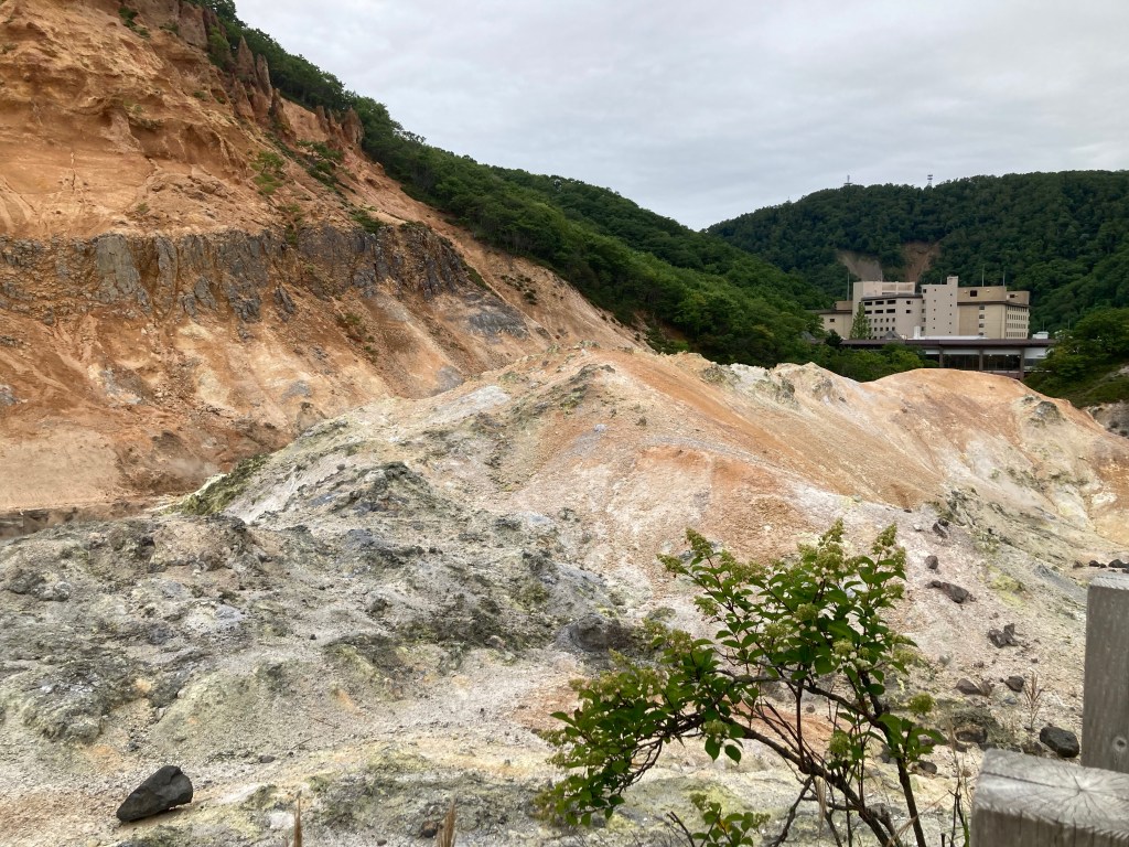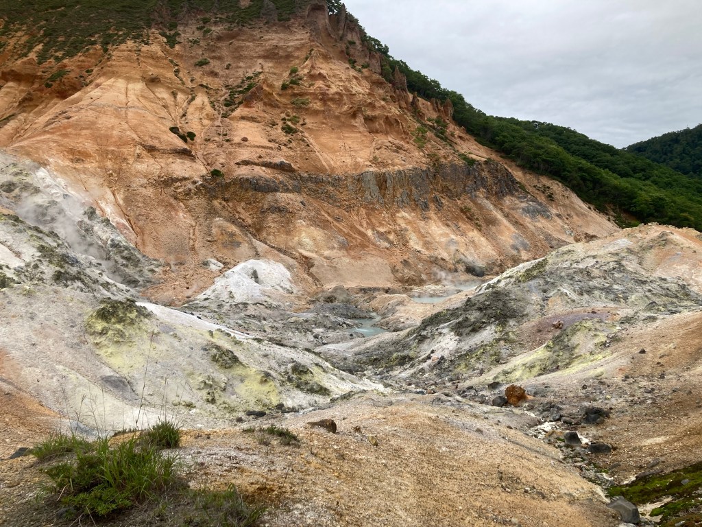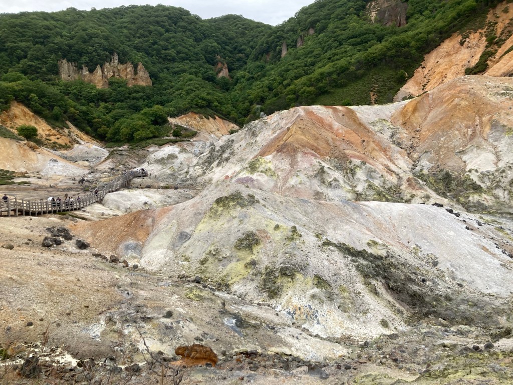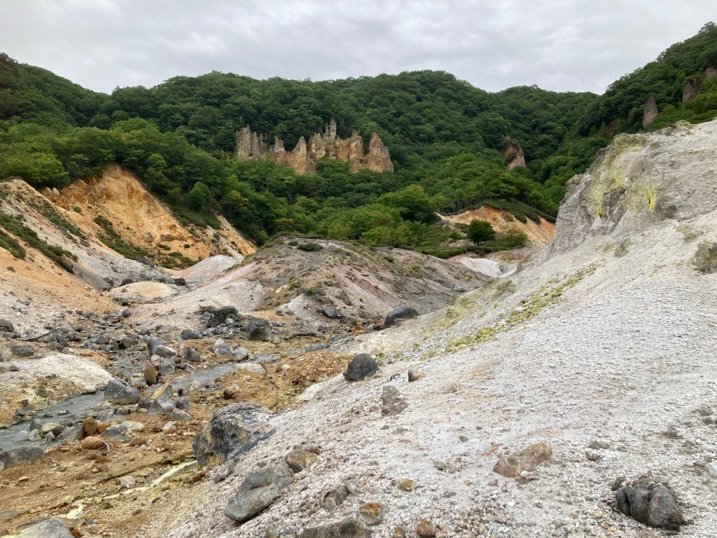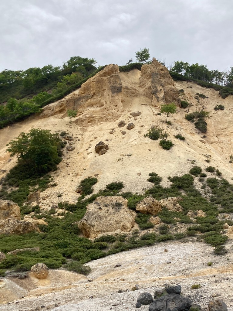 Sous un temps gris et d’une grande tristesse je suis partie de Muroran pour aller visiter le site de Noboribetsu Onsen qui comprend plusieurs parties. Il faut dire qu’une queue de typhon sur l’océan Pacifique se baladait entre Tokyo et l’océan. Et l’océan Pacifique était démonté avec des vagues d’une violence incroyable. Au Japon ils ont des brise-vagues en béton en forme de croix mélangées les unes entre elles. Et je voulais absolument voir le paysage du diable comme disent les Japonais. Et je n’ai pas été déçue.