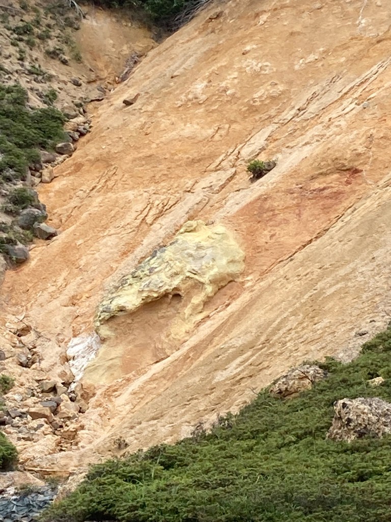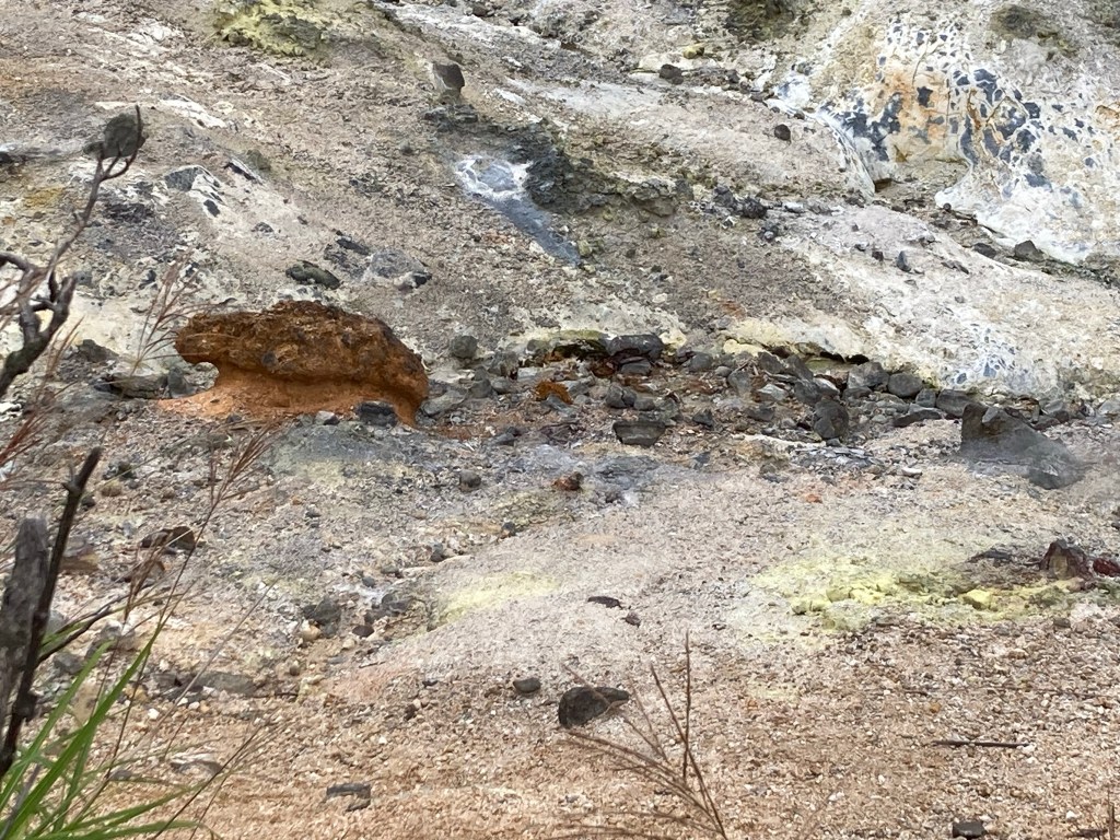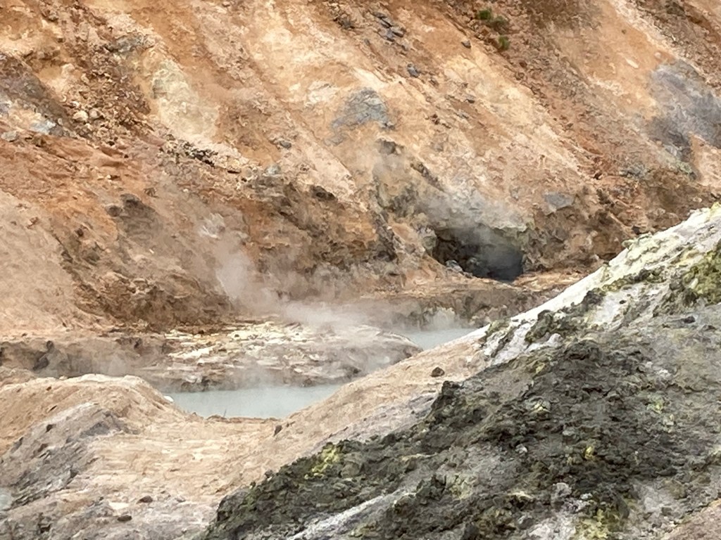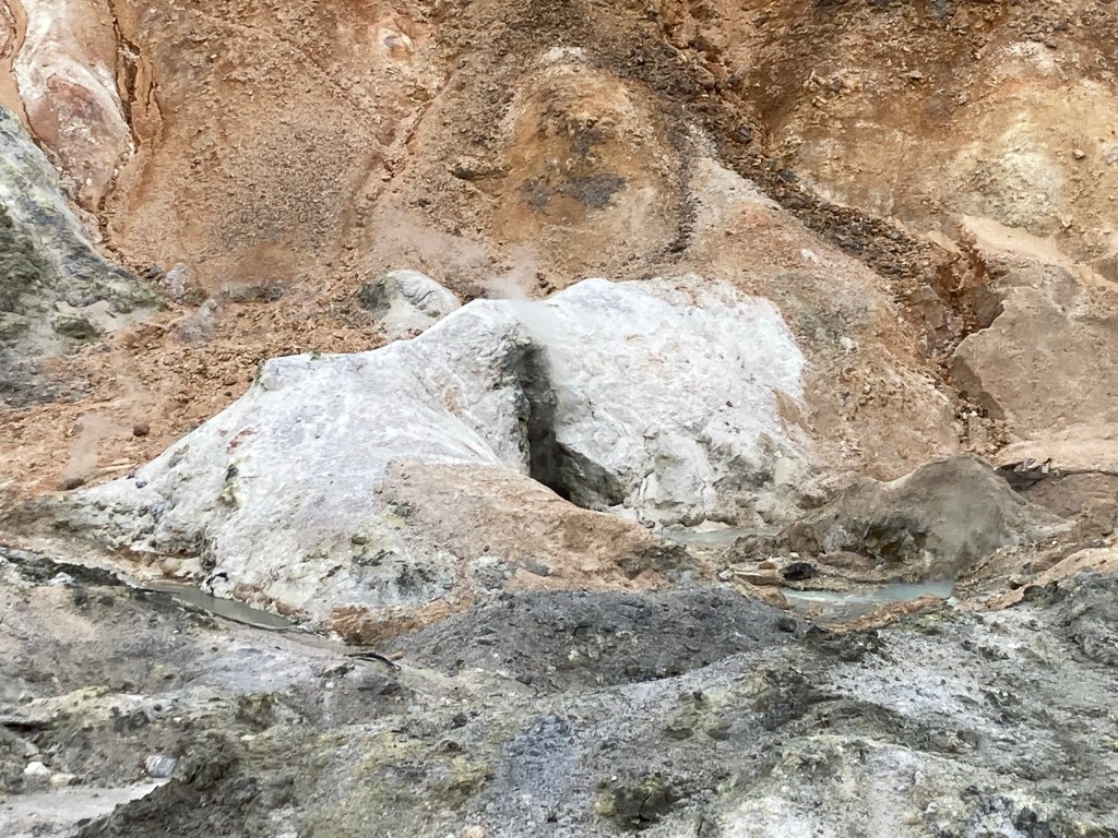 Puis en s’approchant on peut découvrir toutes les couleurs gris cendre et bien voir le souffre jaune odoriférant et attaquant vos narines !