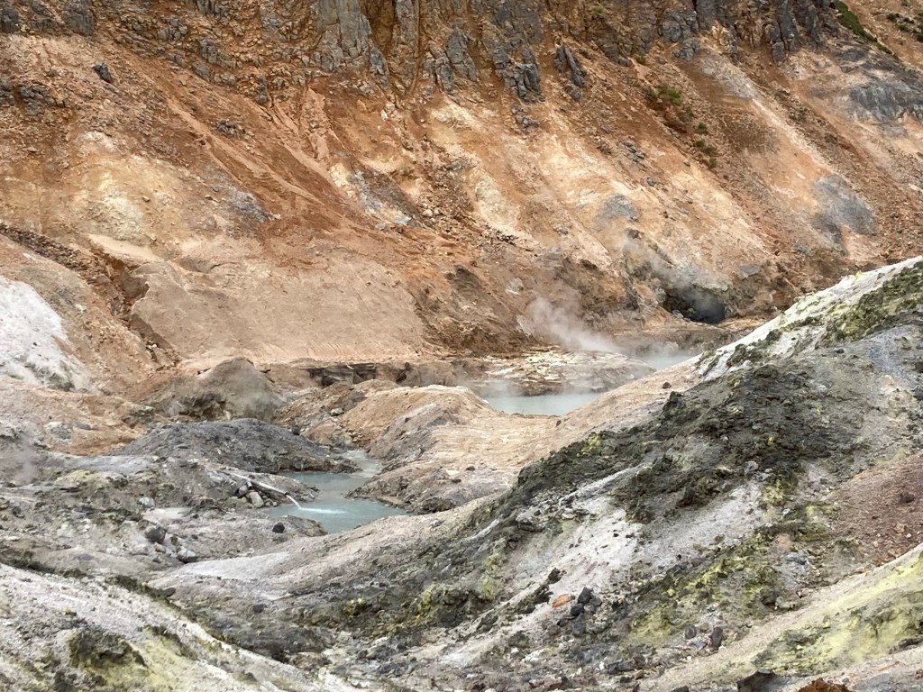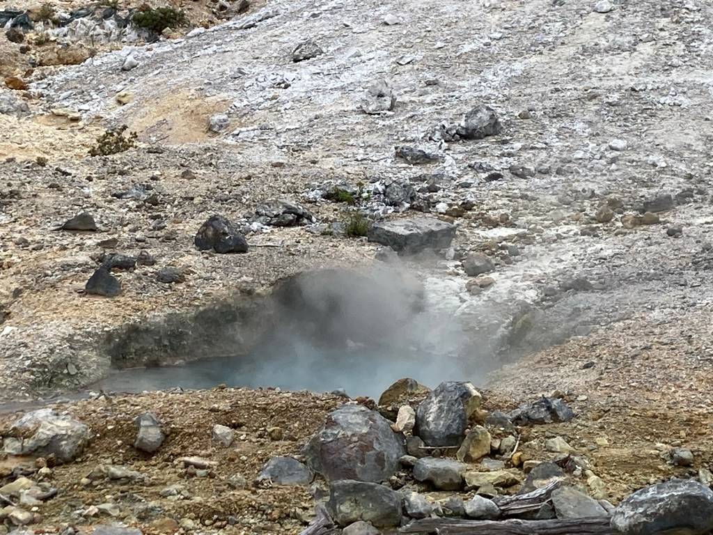 Dans le creux de la vallée coule une rivière bouillante (où je ne mettrais pas mes doigts de pieds de peur de me brûler ou d’être ébouillantée vivante) – elle est d’un bleu turquoise d’où s’échappent des fumerolles.