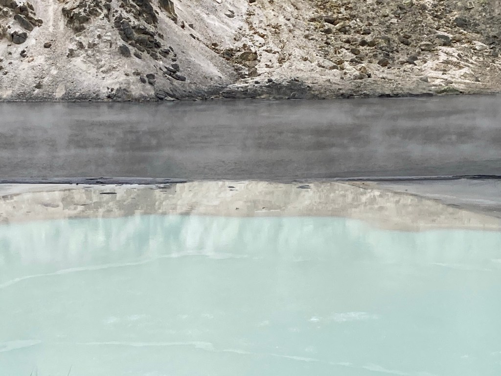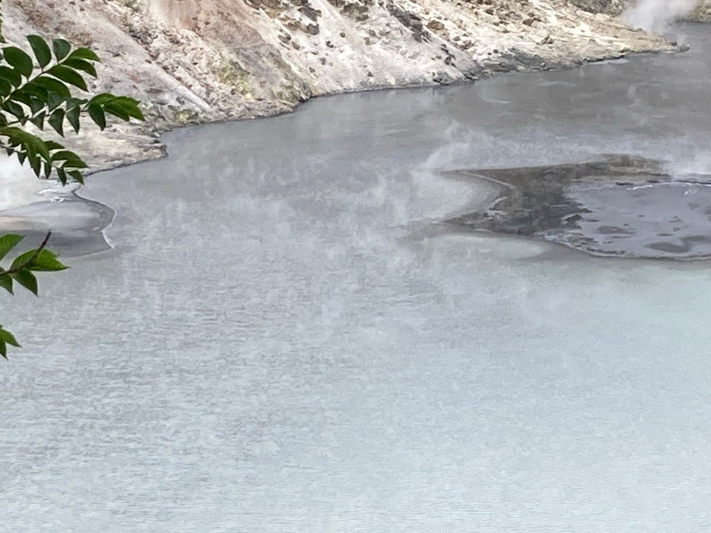 Et puis zoomant je pouvais voir les eaux bouillonnantes faisant comme des petites billes, comme des crépitements laissant s’échapper des fumées qui recouvraient le lac. Processus de la nature incroyable. Je ne m’en lassais pas.
