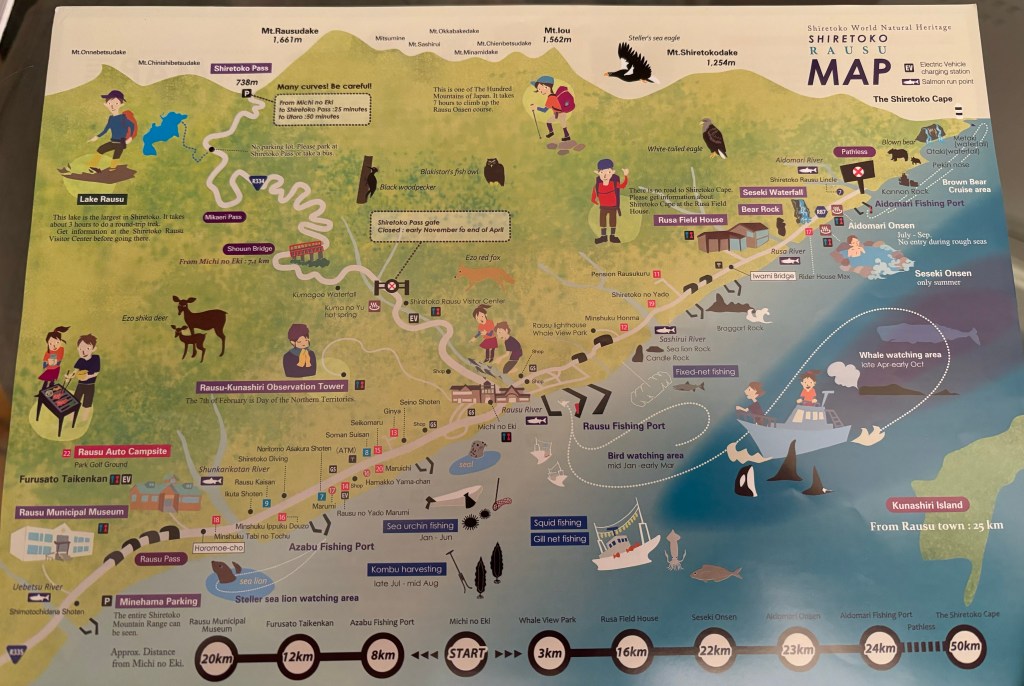 Ce matin là je suis partie tôt de l’hôtel car j’avais un bateau qui quittait à 8h du matin et je devais passer par le mont Rausu et redescendre vers la ville de Rausu, sur le port. Au niveau du mont Rausu le brouillard était dense et je me suis angoissée pour arriver à temps, éviter les animaux et faire attention aux dos d’âne. 37 kilomètres dans le brouillard ce n’est pas très sympa !
