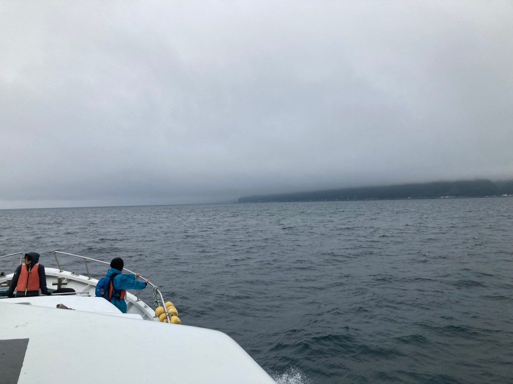 On part vers la zone où l’on peut voir des baleines à une trentaine de kilomètres de Rausu. On longe de loin la côte jusqu’à la hauteur du village d’Aidomari où je retournerais en voiture. Toutes les explications en japonais – alors ça gaze encore plus fort ! Rien à comprendre juste regarder le paysage et chercher les baleines.