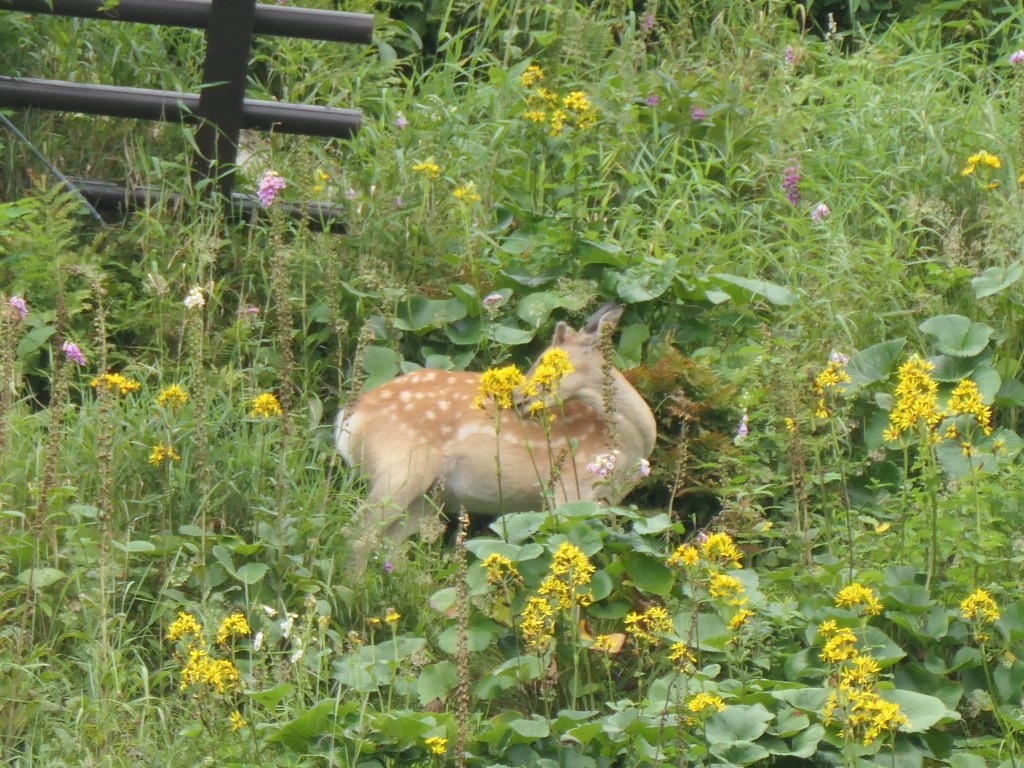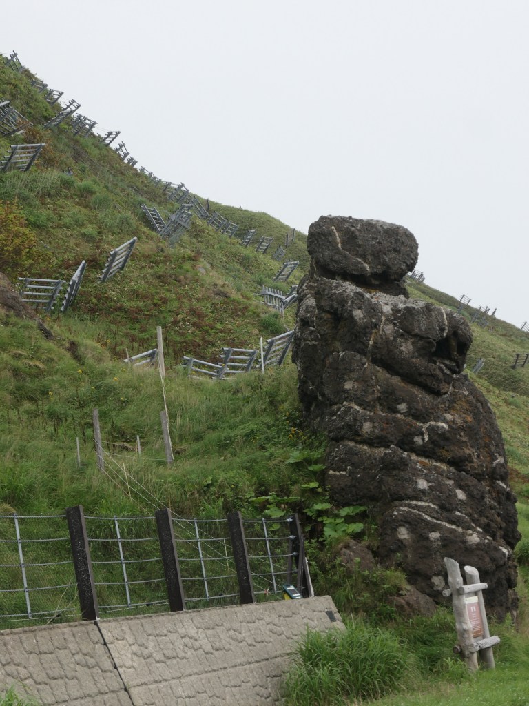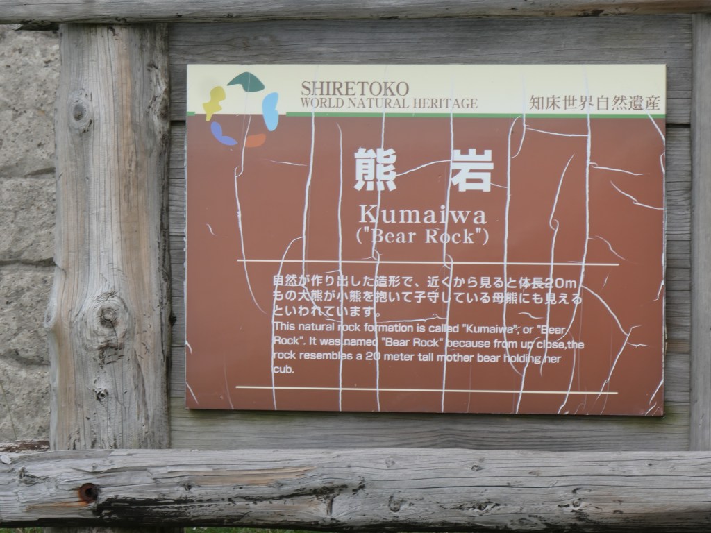 Je passe aussi devant le rocher de l’ours qui mesure 20 mètres de haut – on dirait qu’il tient un bébé ours dans ses bras. Entre temps j’ai croisé aussi un shrine- temple marqué par une porte orange sur le flanc de la montagne qui appartient aussi au parc de Shiretoko (ce dernier venant jusqu’à la mer). Sur un des flancs j’ai vu un daim qui broutait, accroché à la montagne.