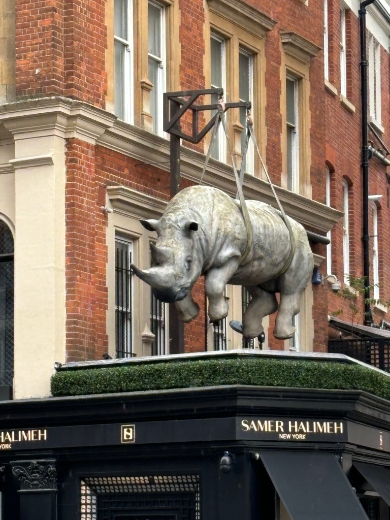 En passant devant une ruelle un énorme rhinocéros pendait avec des sangles au-dessus d’un magasin. Cela donnait le ton !