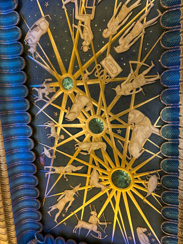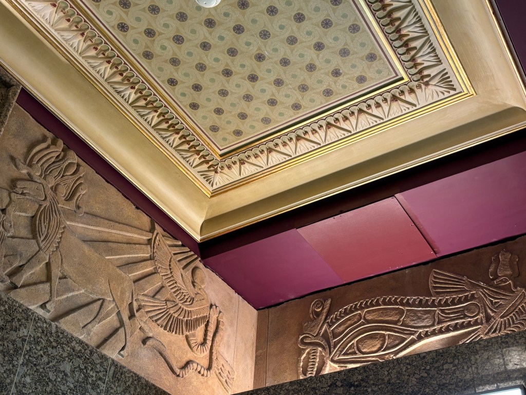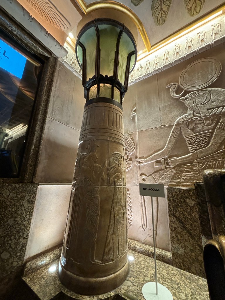 Au rez-de-chaussée les lampes dans des vases à l’envers et des caissons au plafond représentant des têtes égyptiennes avec des têtes de Ram à cornes de buffles.