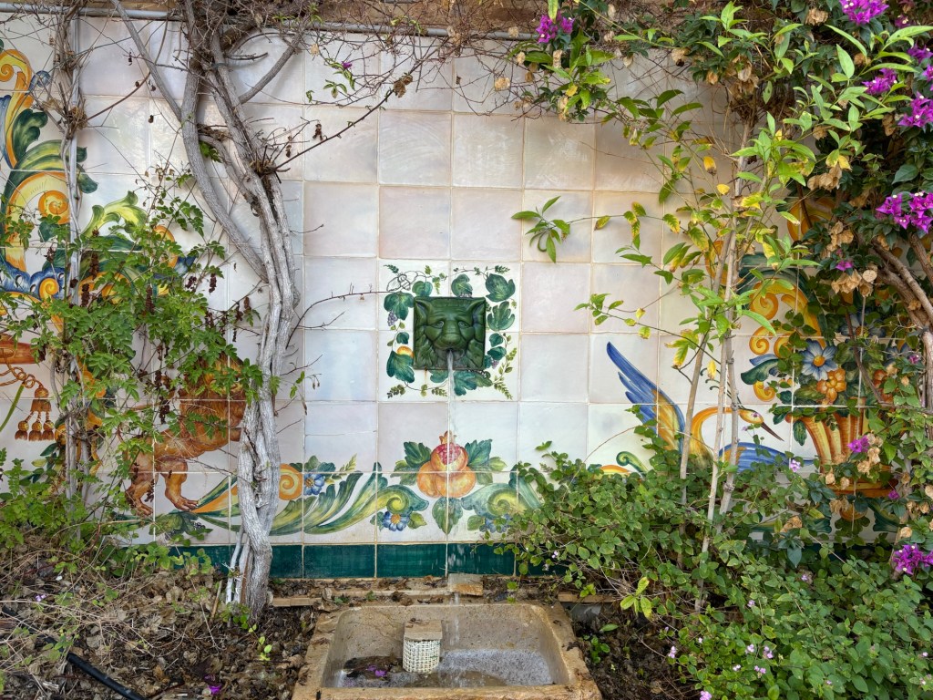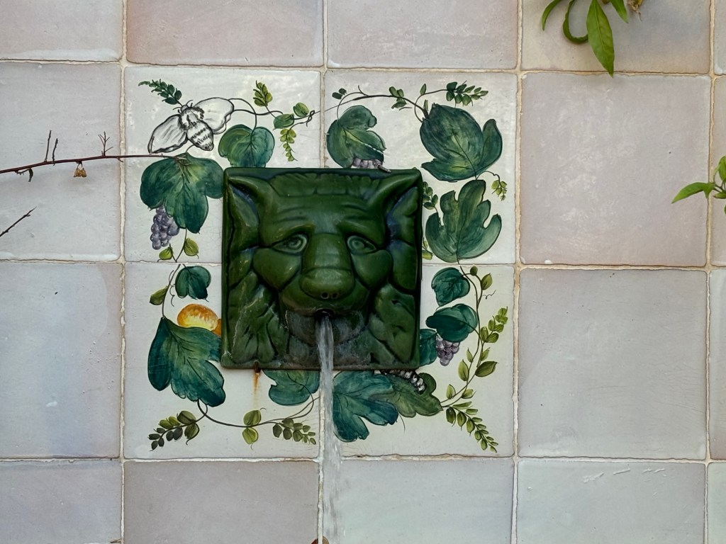 On passait par la cour intérieure pour voir les métiers à tisser. L’endroit est magique car une fontaine laisse couler de la gueule verte d’une tête de lion de l’eau – rafraichissant et reposant !