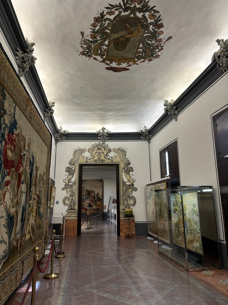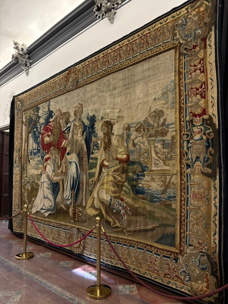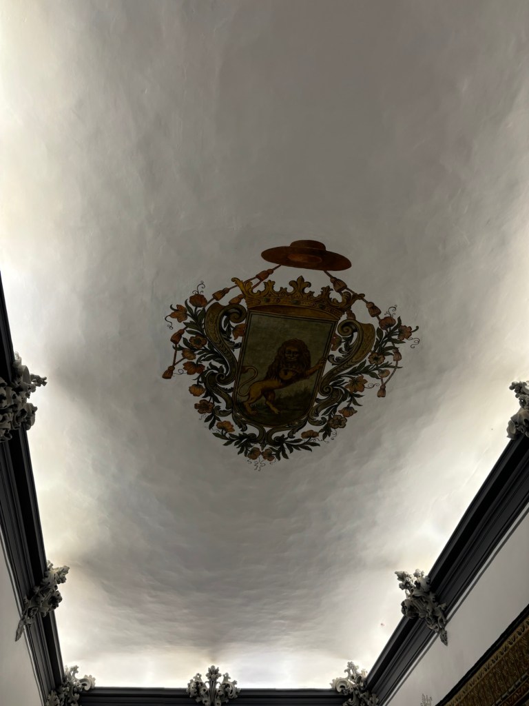 Des armoiries, des tapisseries comme venues des Gobelins qui représentent des scènes liturgiques. Se portes avec des lions les encadrant, les plafonds aux rebords dorés et les tapisseries modernes ornant les salles.