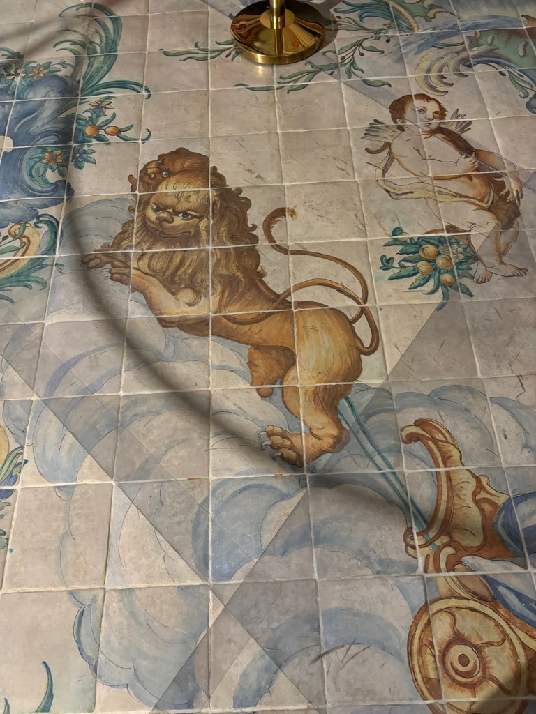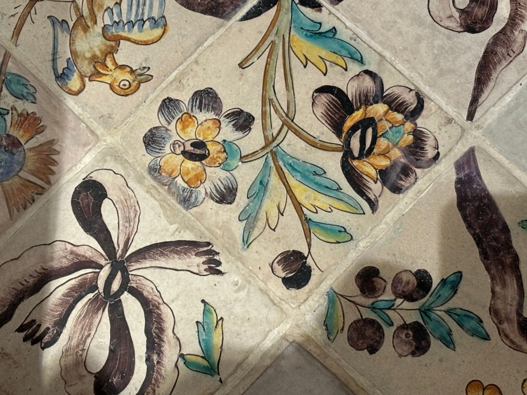Au sol des carreaux avec des fruits sorte de grenades, des fleurs ou bien des lions.