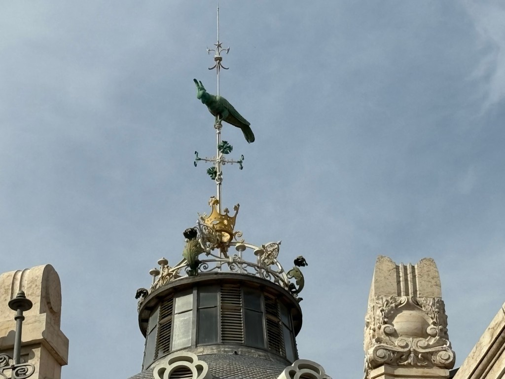 Au centre de l’édifice sur une sorte de coupole se trouve une sorte de grande perruche avec de grandes plumes sur la tête et une couronne dorée en dessous.
