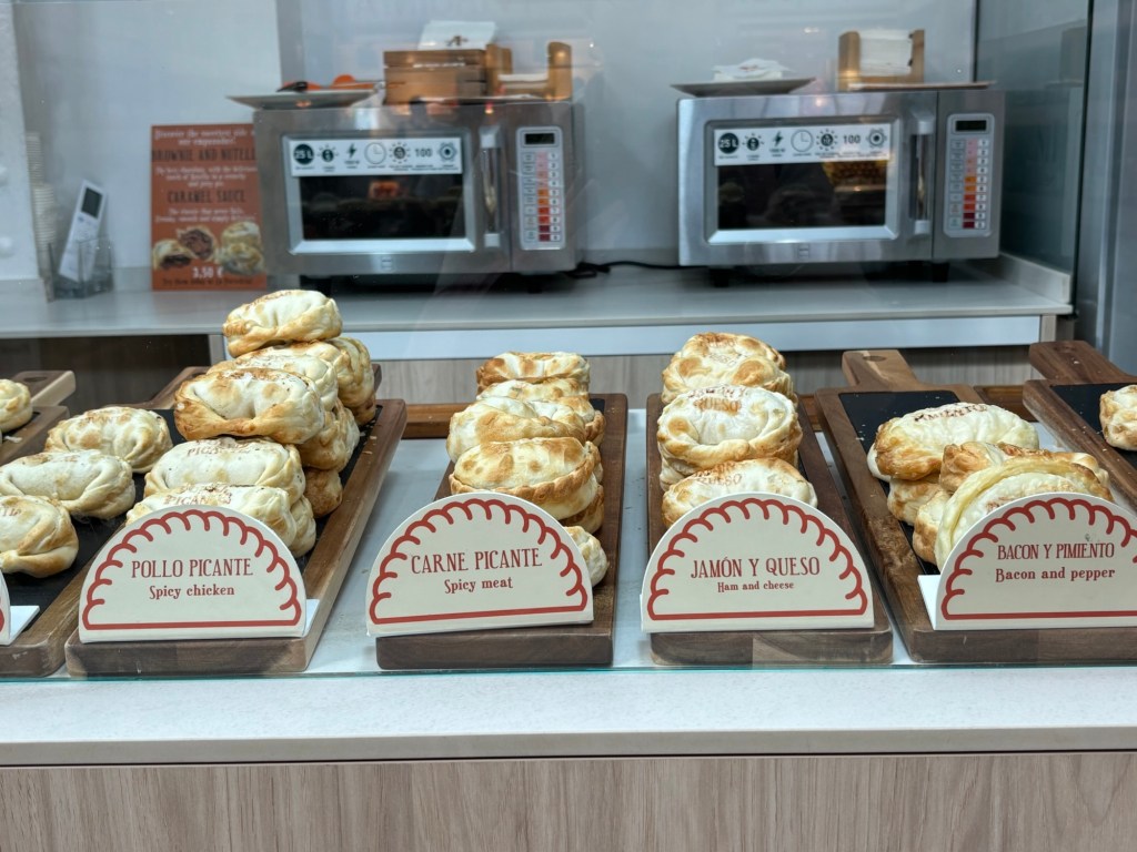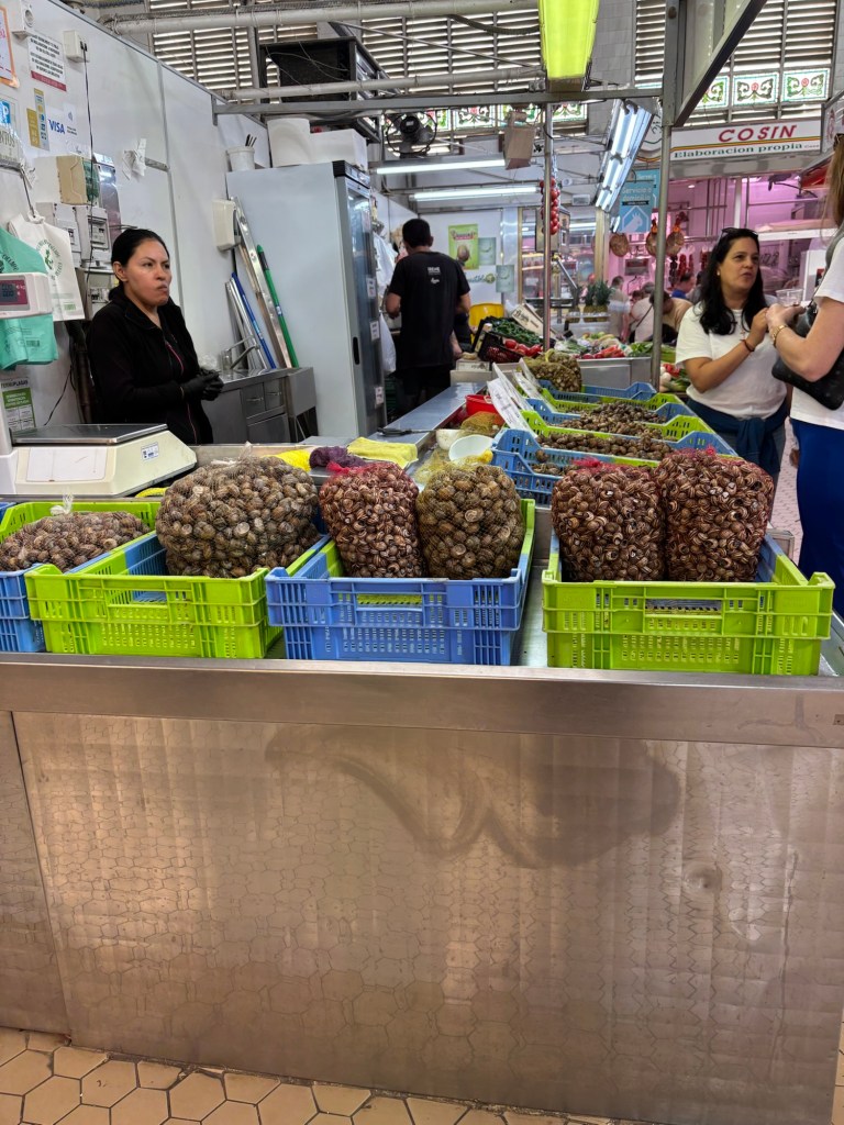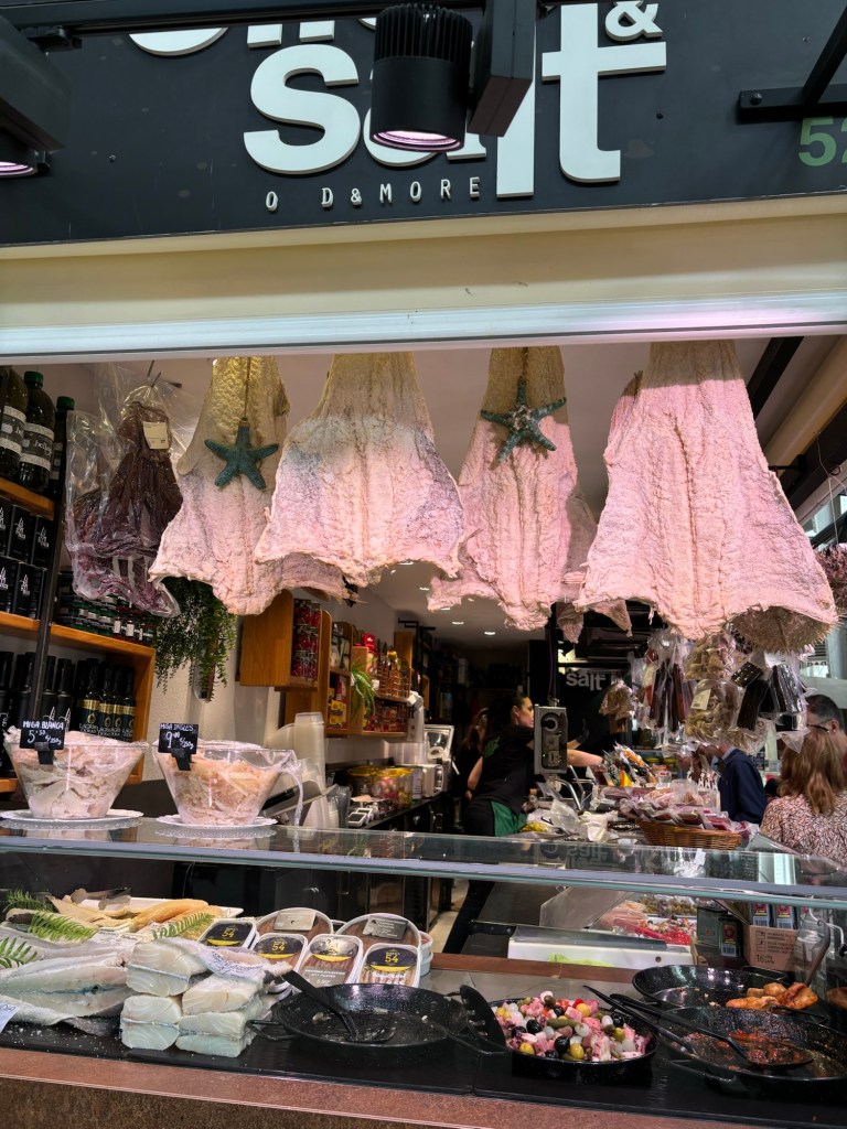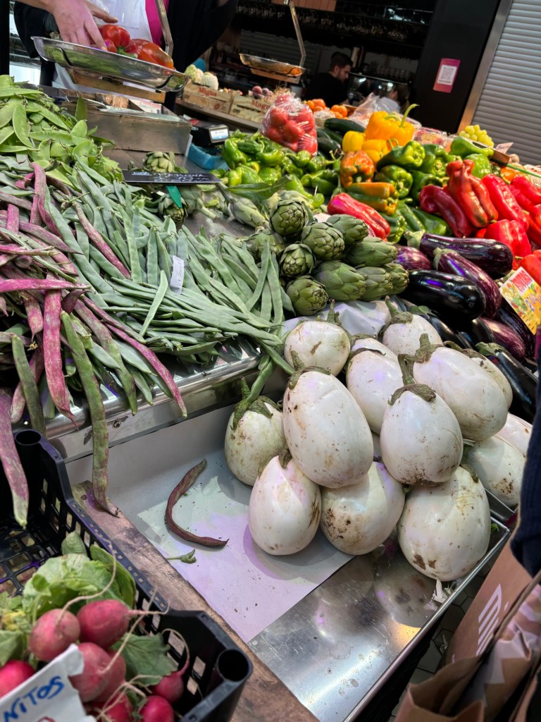 Et puis glissons vers les marchands : poissons et morues séchées ; charcuteries et jambons entiers qui pendent ; oursins, huitres et langoustines qui vous tendent les bras ; sacs de bulots ; empanadas en tout genre ; olives et condiments à se damner ; légumes et je découvre des aubergines blanches.