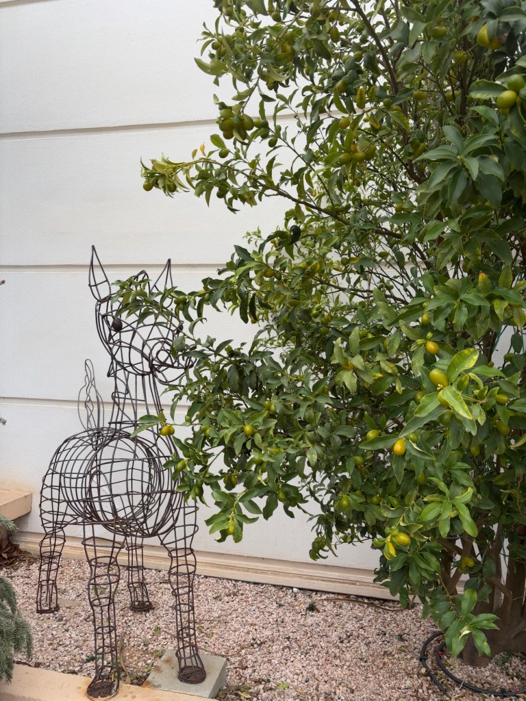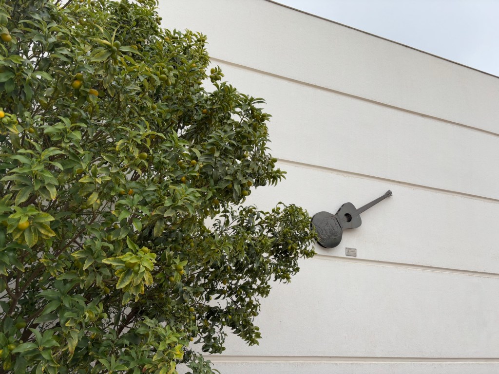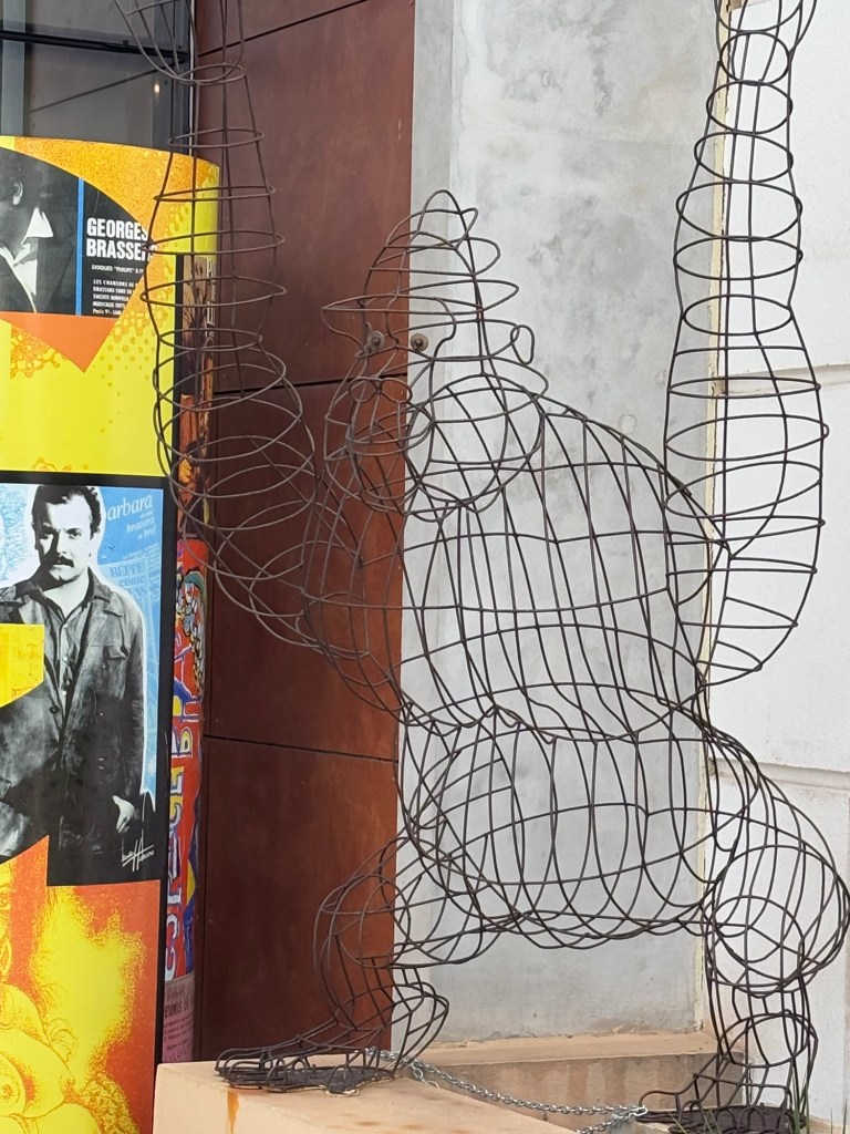 En sortant du site on peut voir un gorille et un âne en fil de fer, une guitare et un bateau.