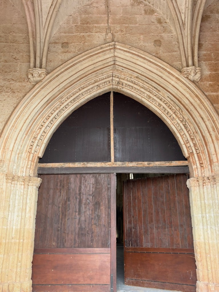 Une entrée avec deux tours carrées de chaque côté et une grande porte de bois de chêne avec des ogives. Poussant la porte vous découvrez sou vos yeux la splendeur de la nef principale et de ses sept travées.