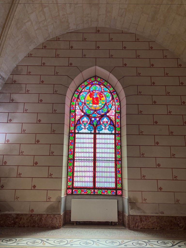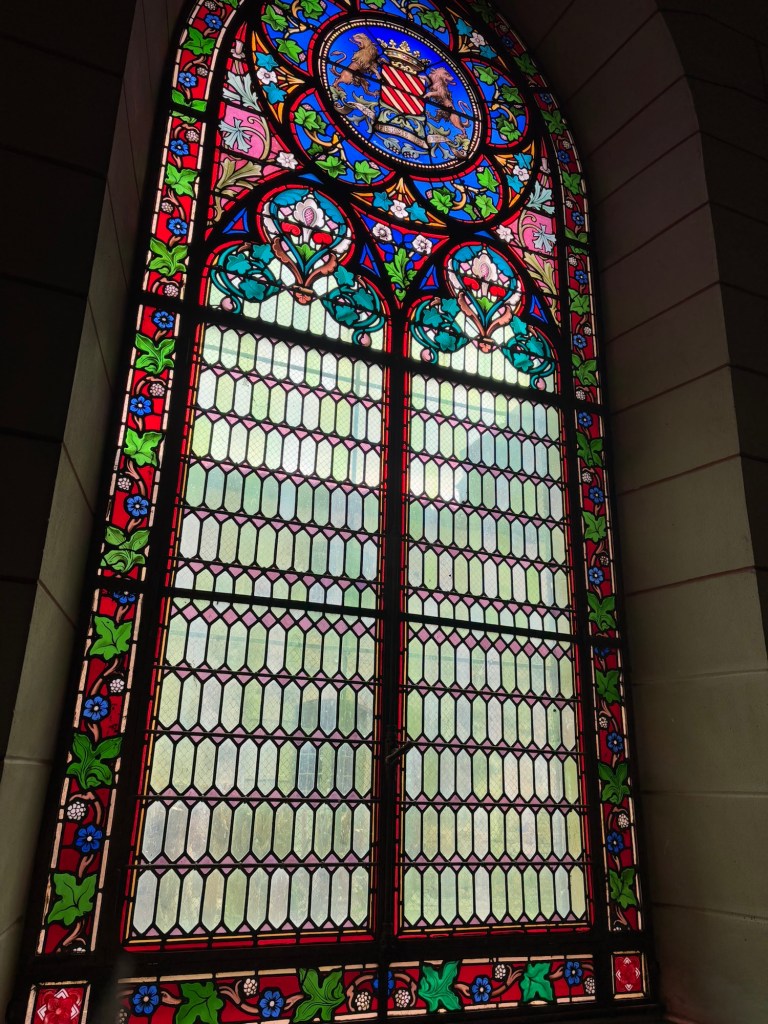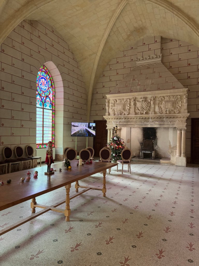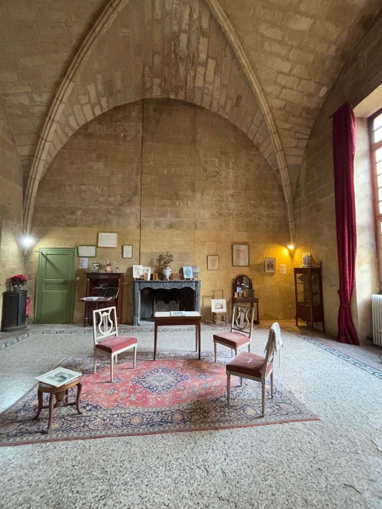 Il y a la grande salle avec la cheminée décorée sur son linteau et les très beaux vitraux. Un petit salon où on peut admirer la hauteur des voutes.