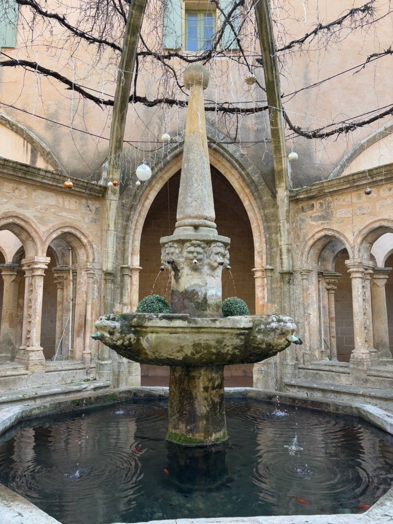 On y découvre le cloître et surtout pour moi la fontaine où le chant de l’eau vous transporte dans une réflexion intérieure profonde. Dans le bassin des poissons rouges et noires voguent.