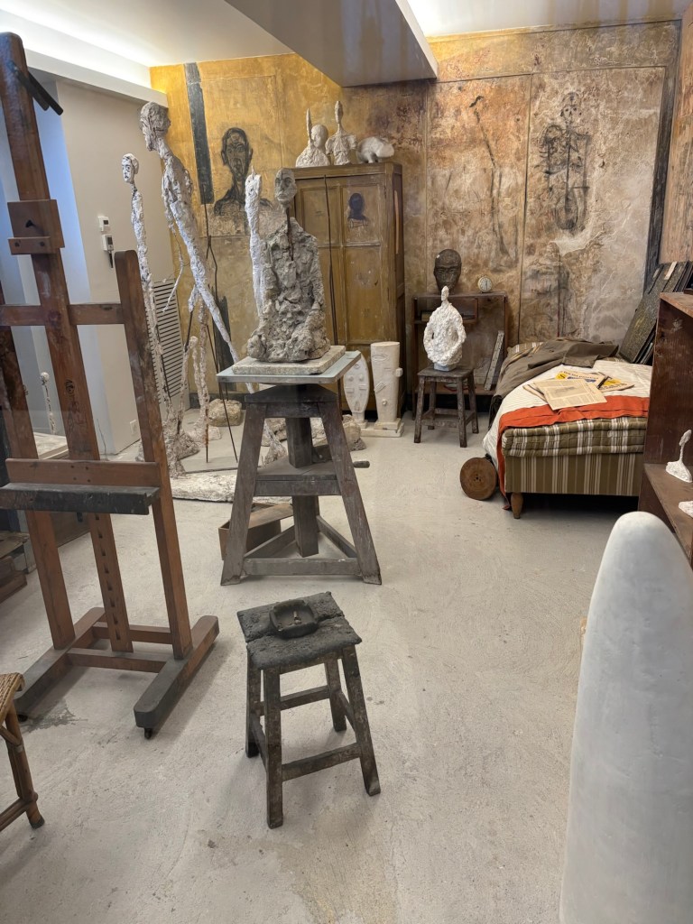 Quand on entre dans ce lieu on est immédiatement surpris de trouver à sa droite, en contrebas, l’atelier de Giacometti tel qu’il était rue Hipolyte-Maindron. Un espace confiné où l’artiste vécu à partir de 1926 jusqu’à sa mort en 1966. Ce fut son lieu de création, d’inspiration et de vie qu’il partagea avec sa femme. Car rue Hippolyte-Maindron il finira par louer plusieurs ateliers mitoyens qui seront ses lieux de vie. Sa femme Annette, devant libérer les lieux en 1972, décida de démonter les murs peints, de conserver les objets, les mobiliers, les outils et les œuvres jusqu’au mégot de cigarette. Son atelier fut alors recréé en ce lieu.