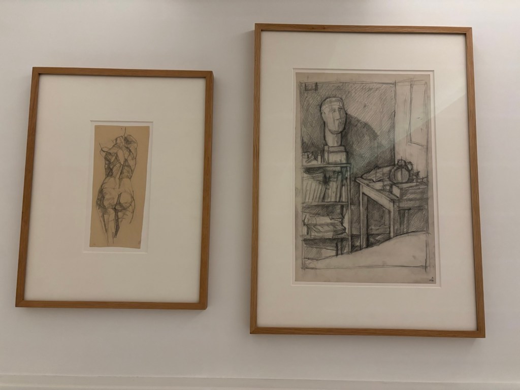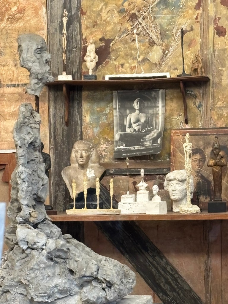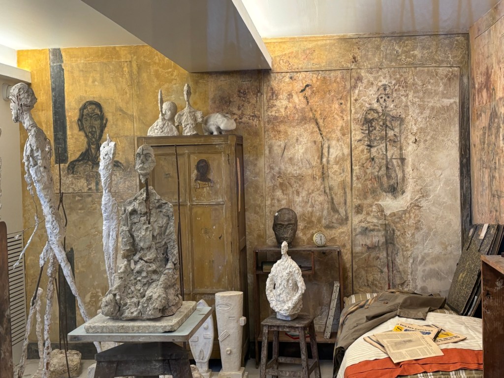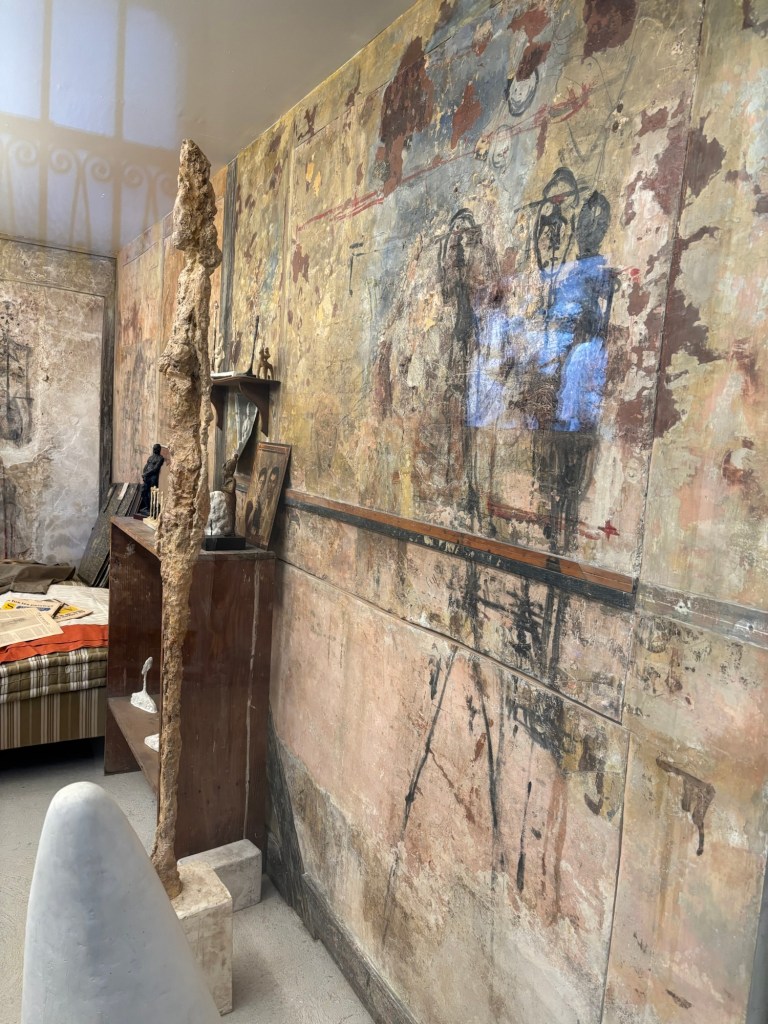 C’est touchant de pouvoir admirer les œuvres, les dessins sur les murs qui ont permis à Giacometti de réaliser les sculptures et statues en terre. Le lit dans le coin, les quelques meubles où sont posés des objets comme la photo d’un Bouddha ou bien la tête d’un sphynx Égyptien et ses propres œuvres accolées à ces derniers.