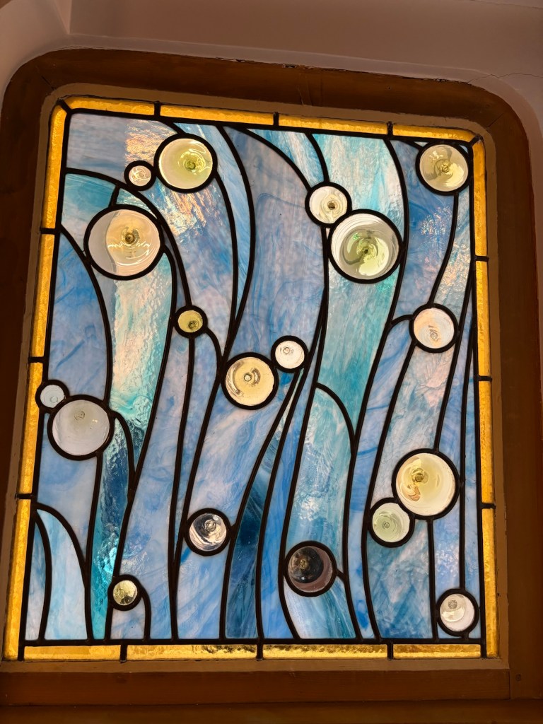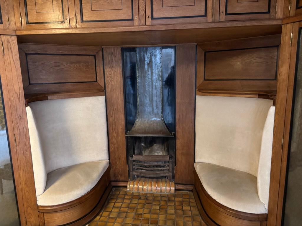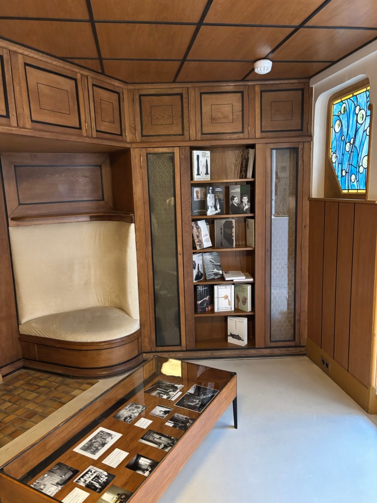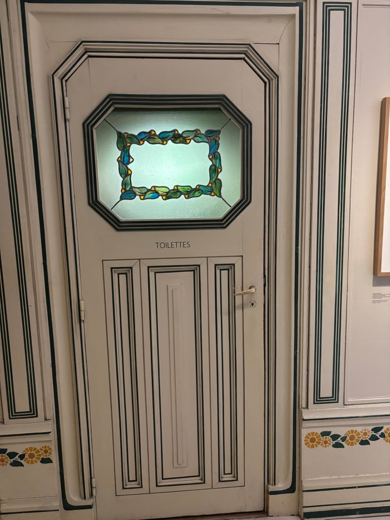 Et puis nous entrons dans la maison de Follot et là j’ai le souffle coupé par la pureté du lieu : blancheur des murs, forme des pièces voué au culte de l’Art nouveau et art déco. Vitraux bleus avec des bulles blanches ou jaunes pâles ; carreaux en damier bleu et doré au sol ; portes vitrées séparant les pièces aux formes ovales ou arrondies ; coin cheminée et bibliothèques aux somptueux carrés ornés de noir ; cheminée stylisée très pure avec ses coins fauteuils où l’on peut s’asseoir et vivre un moment à soi. Et la grande salle ouverte sur le toit avec la bibliothèque dans le fond où l’on peut lire tranquillement. Les portes avec des vitraux faits de feuilles et dans une autre pièce les murs en bois avec des dessins d’arbres ou bien des plafonds décorés de fleurs jaunes et feuilles vertes. Tout est dans le détail jusqu’aux portes des toilettes. Et même la vasque des toilettes est en marbre vert stylisé.