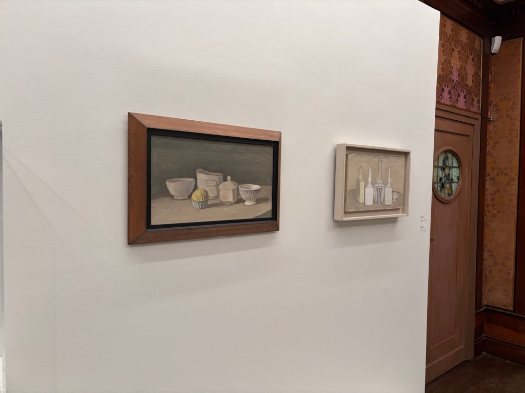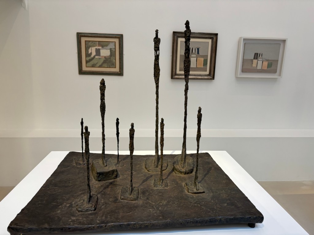 Tous les deux sont italiens, l’un vivant à Bologne pour Morandi et à Paris pour Giacometti. Ils ne se sont jamais croisés mais ont des similitudes dans leurs œuvres. Nature morte, dessins de paysages. Sobriété et pureté. Elancement dans leurs dessins.
