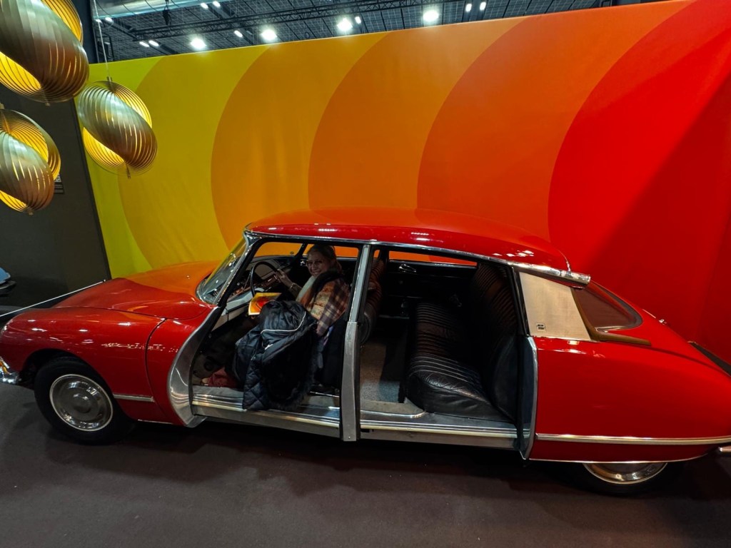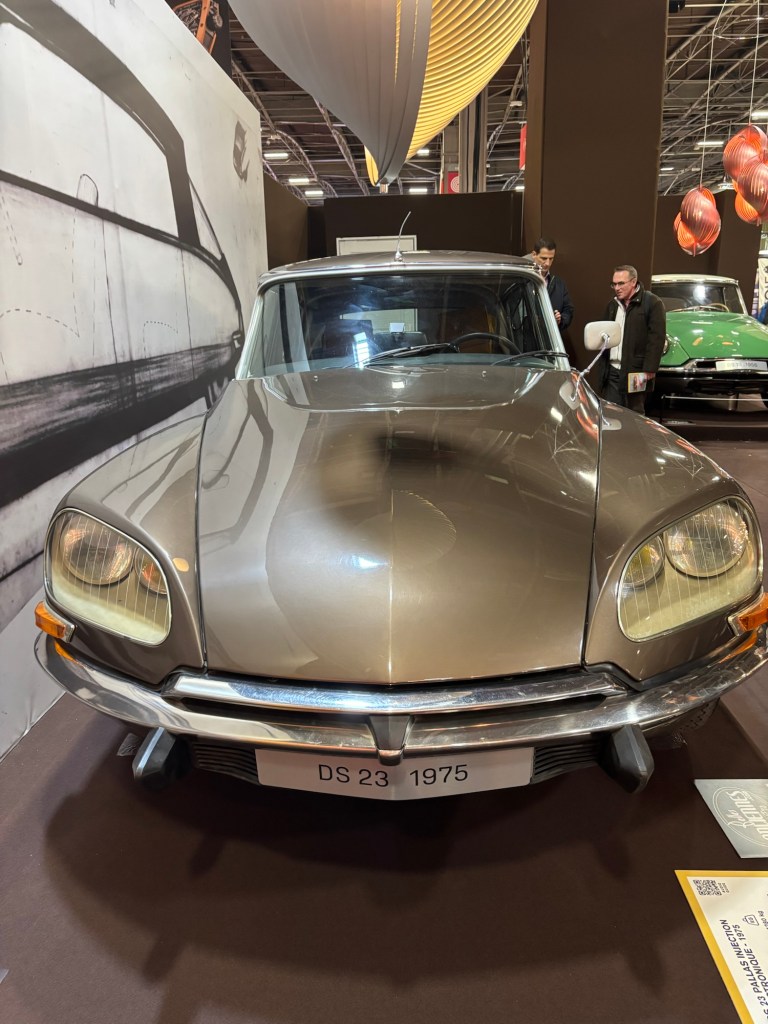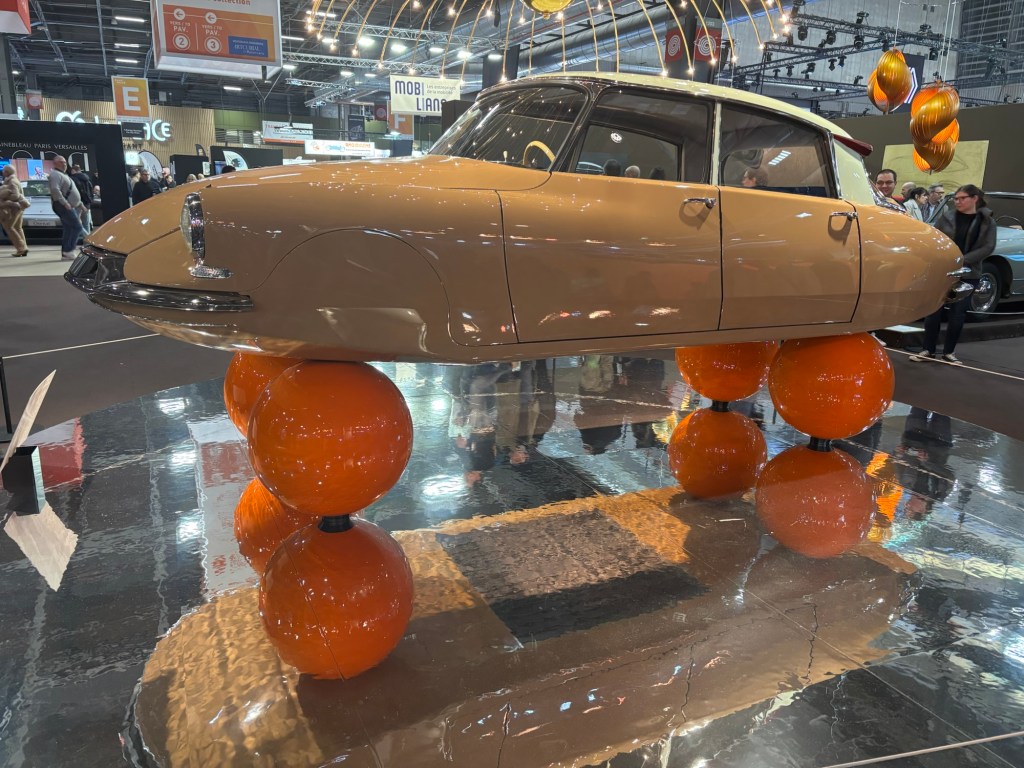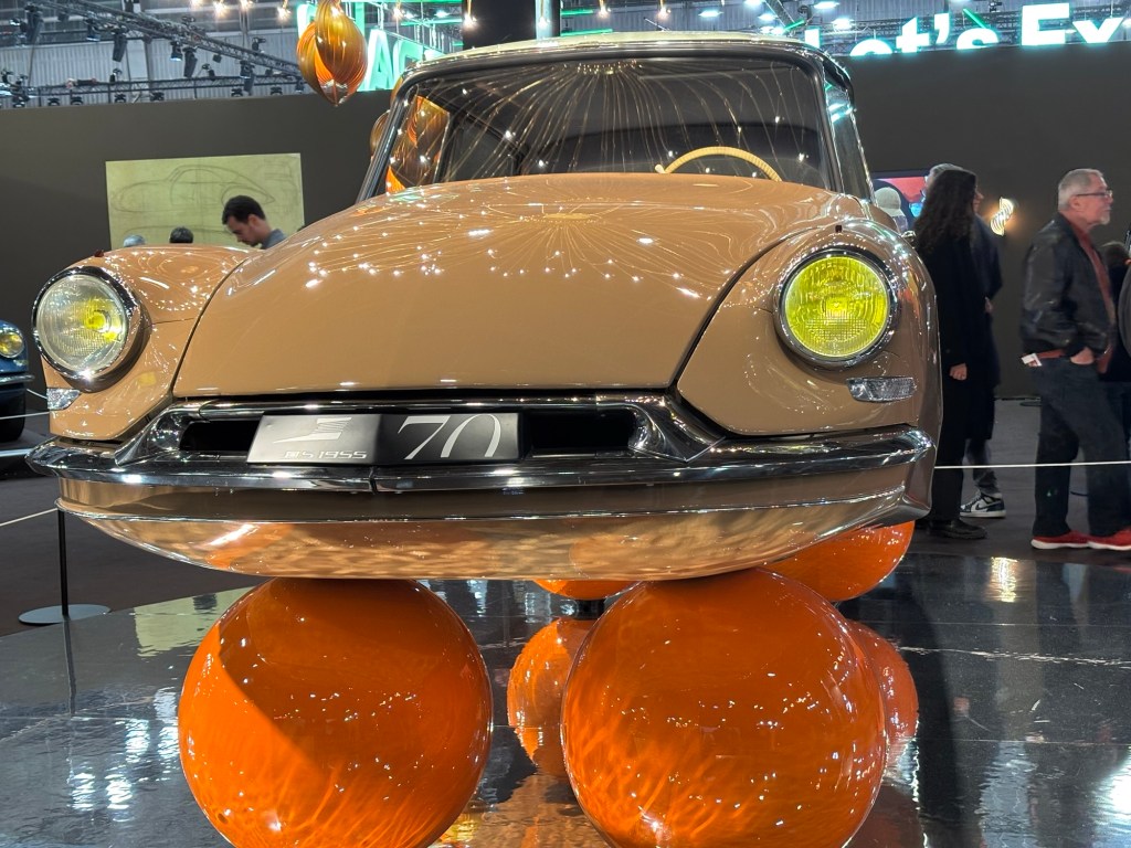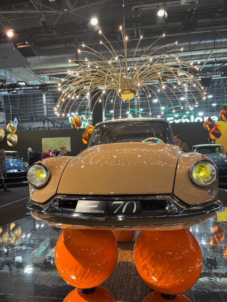 Au centre du stand cette magnifique DS marron clair posée sur quatre boules, roues orange. Elle ressort incroyablement ! Elle date de 1955 … et on va remonter jusqu’en 1975.