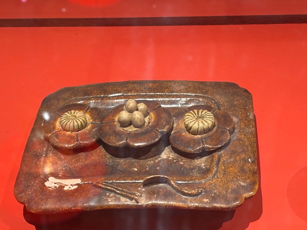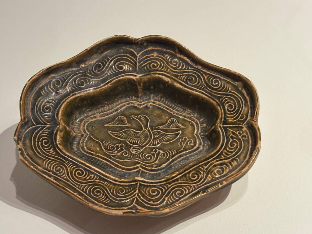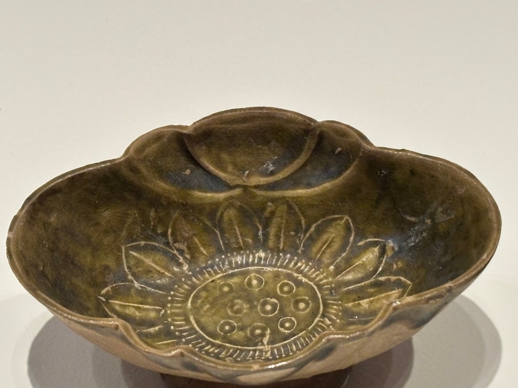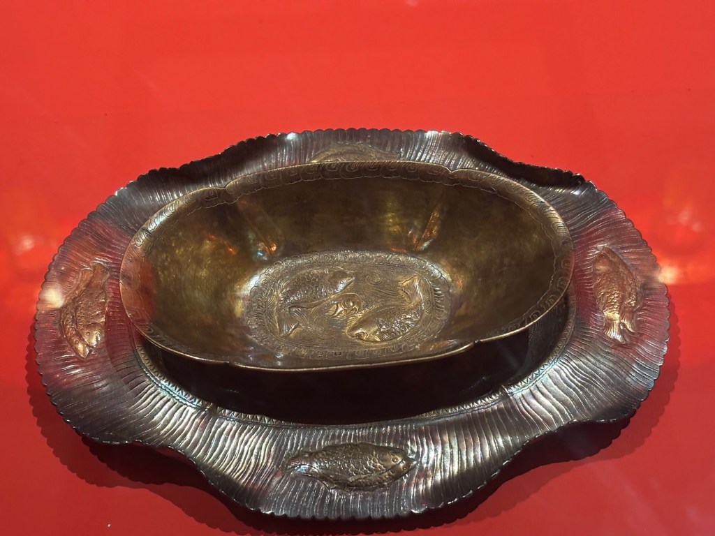 Des morceaux de mur, des boites à thé, des coupes en argent avec des décors de poissons ciselés sur des feuilles de lotus. Des coupes en céramiques avec les fleurs de lotus ou bien des canards.