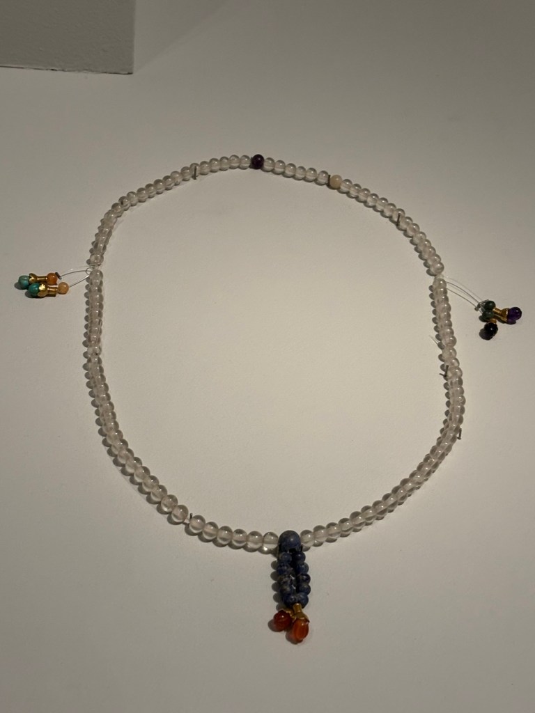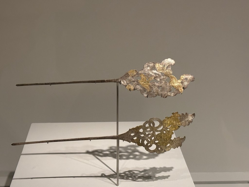 Quelques beautés d’art avec des pinces à chignons, des colliers de perles de verre et de pierre précieuses ou des ceintures ciselées avec des fleurs.
