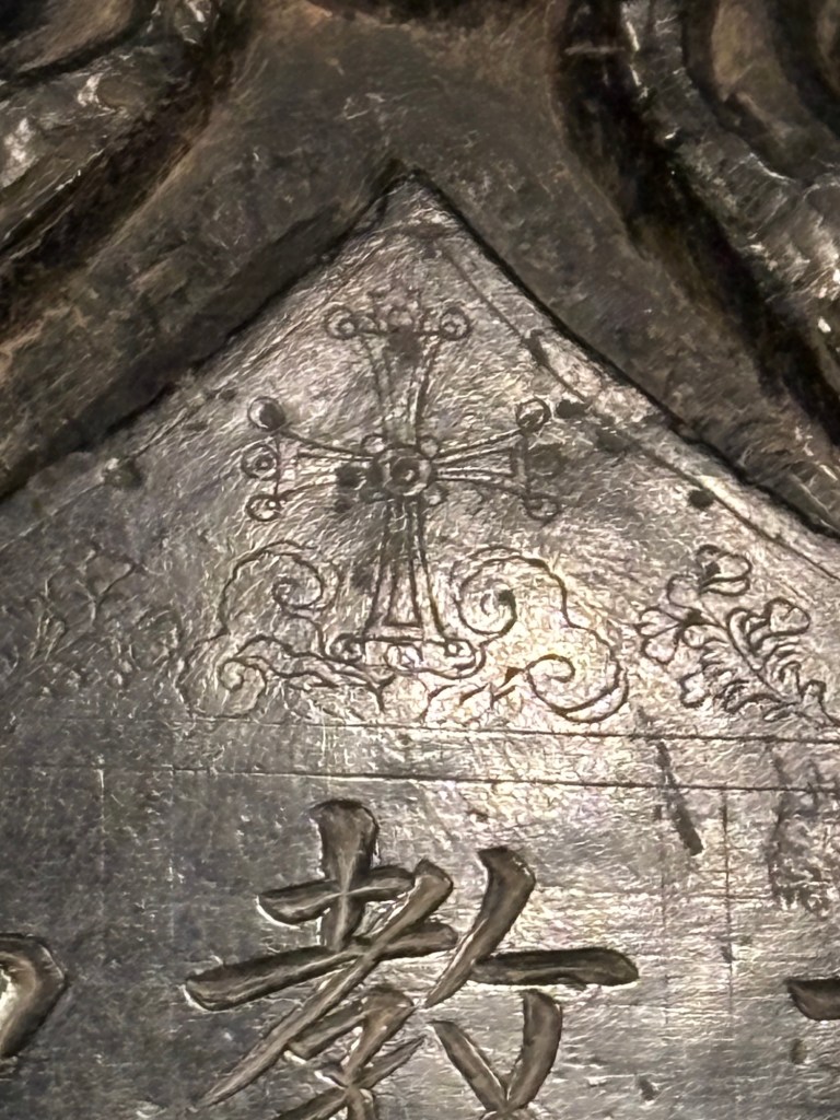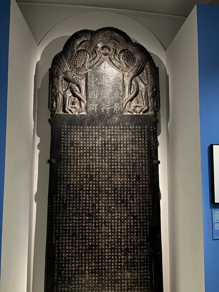La religion nestorienne est aussi très présente à travers la stèle nestorienne de Xian où l’on peut voir sur le haut une croix chrétienne d’Orient. Sur la stèle 1780 caractères chinois qui retracent l’expansion de la religion nestorienne sur près de 150 ans en Chine. Elle appartiendrait au grand maitre nestorien Jinging d’époque Tang. Elle est dédiée à un membre d’un famille originaire de Boukhara.