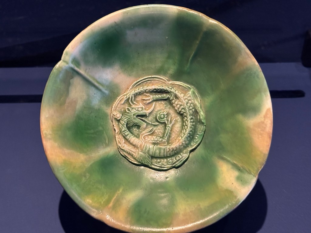 Enfin la route de la soie avec ces merveilles comme ce paon ciselé de turquoises, cette oie et ces tissus. Une très belle coupe en céladon avec ce poisson au milieu et celle verte beige avec un dragon.