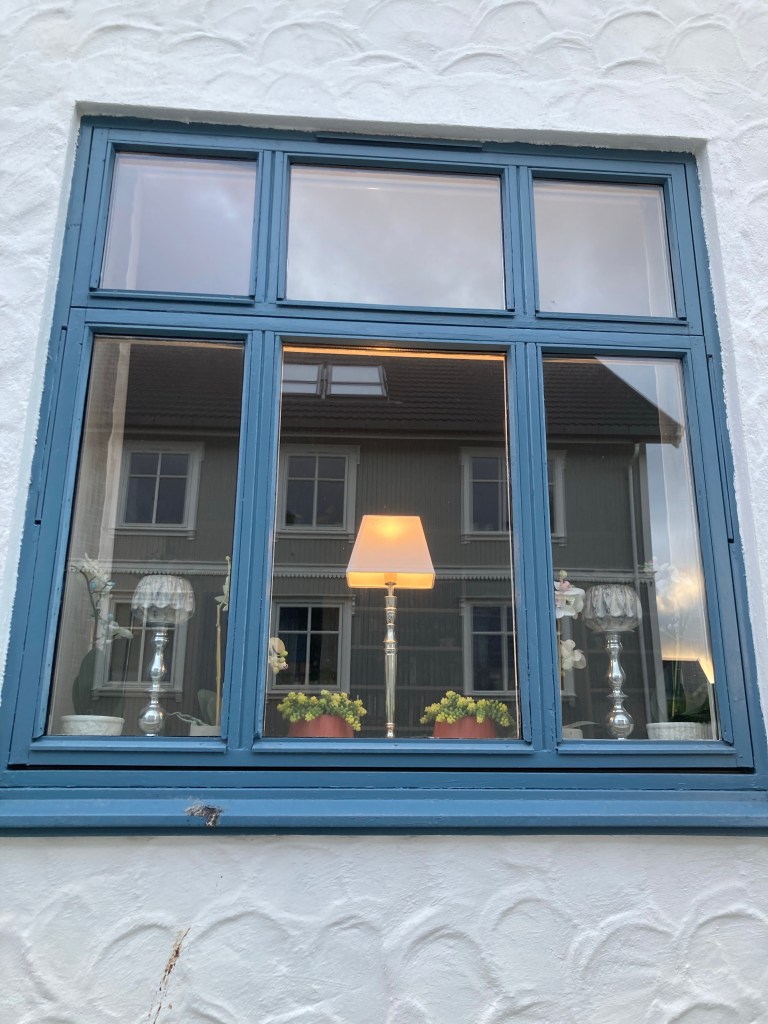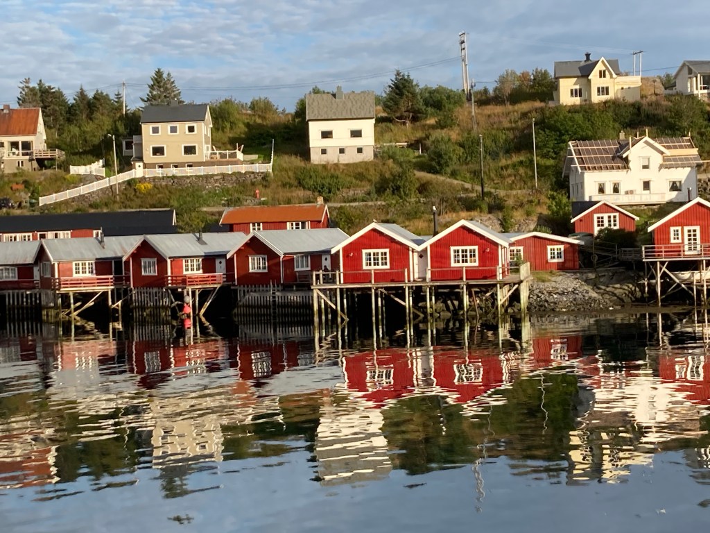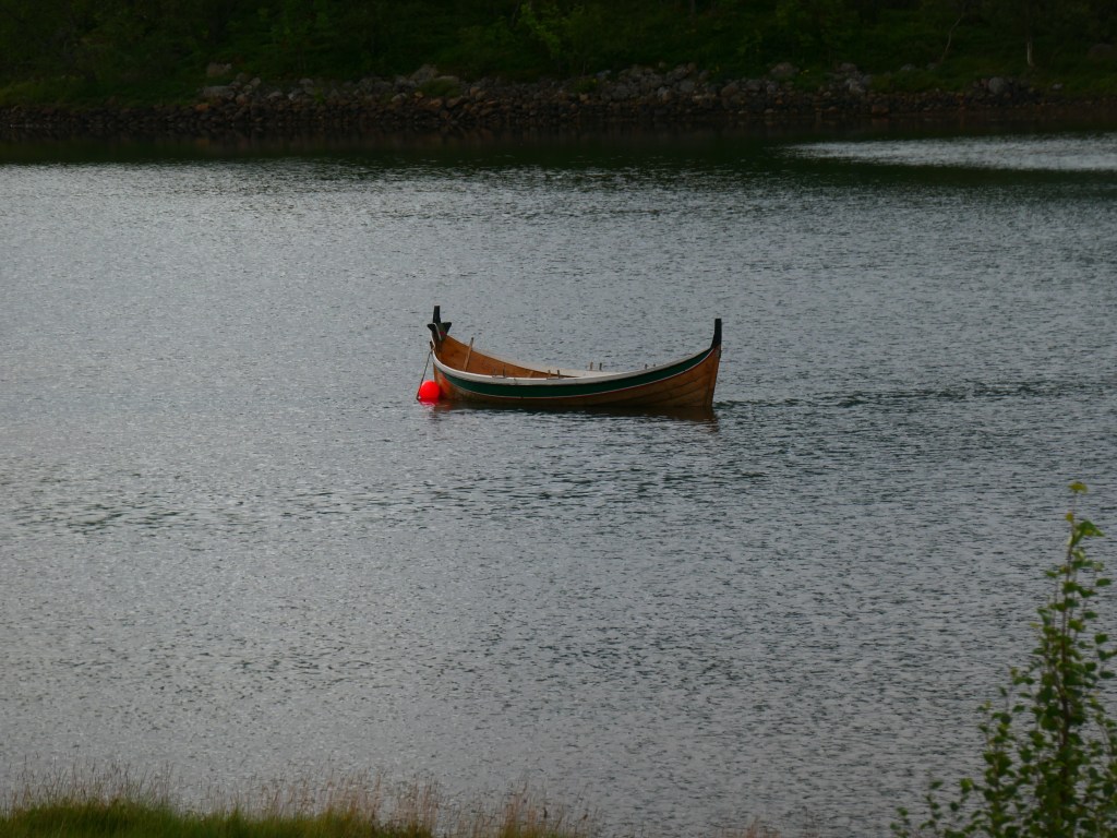 Et les villages avec les rorbus – maisons typiques de pêcheurs de morues, jaunes, rouges et bleues selon l’endroit et les ports des iles Lofoten, juchées sur leurs pilotis où clapotent les vagues créées par les chalutiers comme des berceuses. Toujours deux sièges en bois devant les rorbus qui attendent le contemplatif. Les jolies boites aux lettres colorées représentant la montagne à Svolvaer. Et les fenêtres qui sont toutes avec des lampes allumées mais décorées de plantes colorées et d’objets ; les barques sur les lacs qui voguent au gré du vent.