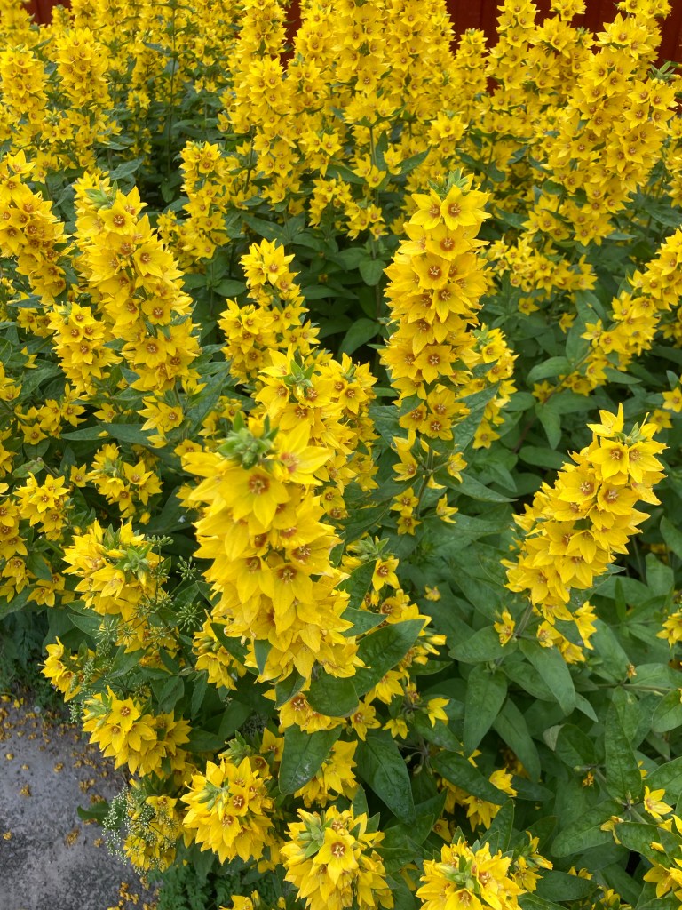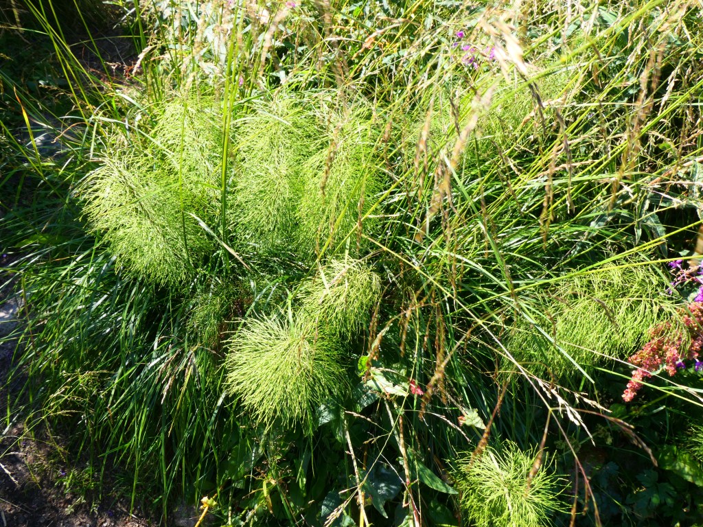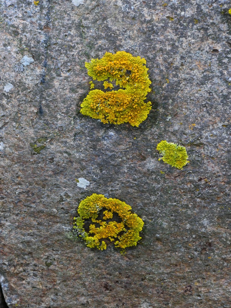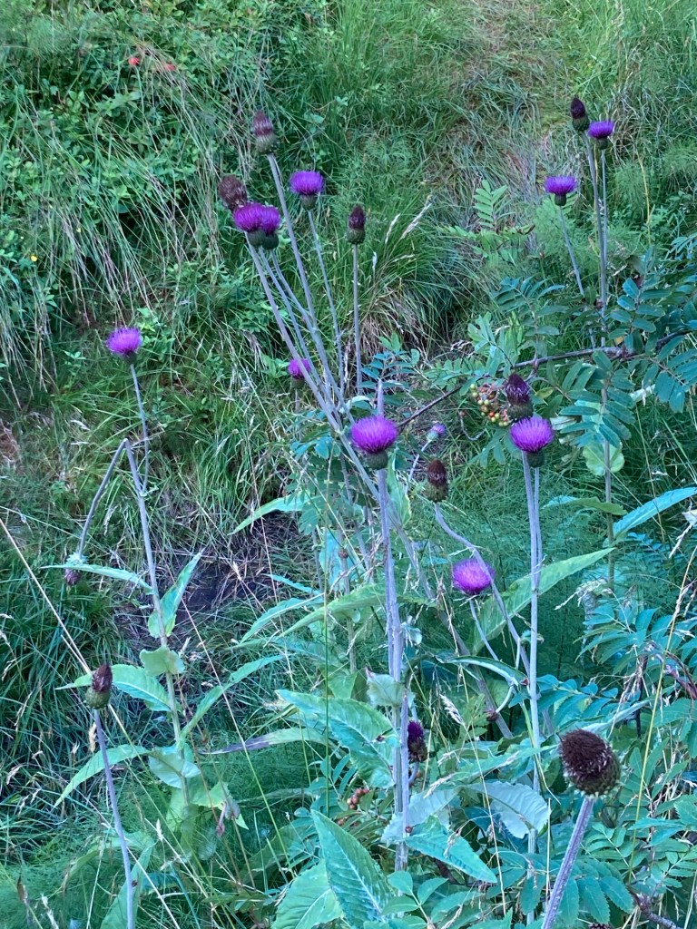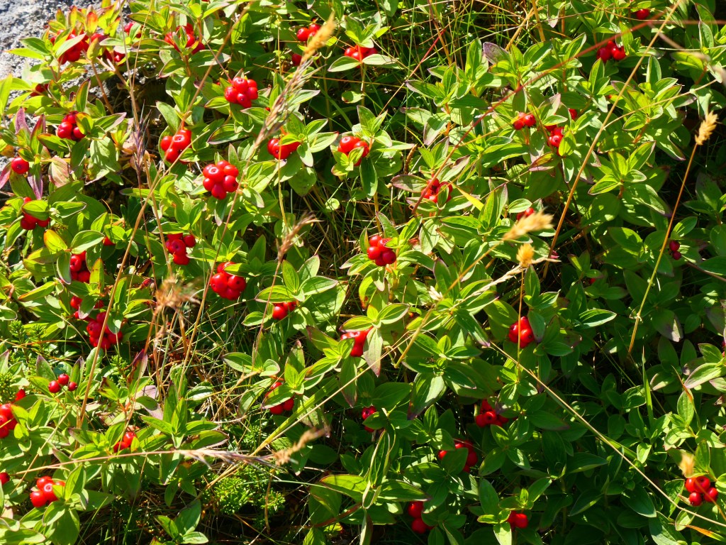 Les fleurs des champs de jaune mais aussi de mauve – des tapis jaunes de lysimaques ponctuées et des mauves, les épilobes en épi que l’on trouve partout sur les bords de routes ou le long des maisons ; les linaigrettes blanches à feuilles étroites qui voguent comme des aigrettes blanches au vent dans les champs et surtout dont la fleur ressemble à du coton (texture, douceur et épaisseur) ; les cornouillers de Suède, ces baies à boules rouges qui ne doivent pas être comestibles mais qui colorent la toundra. On les croise à tout bout de champs et elles tapissent les sols proches de la roche ; les chardons mauves qui éclosent pendant l’été ; les prêles des bois toutes petites et si frêles qui voguent au vent avec leurs aiguilles toutes tendres– car le vent est souvent froid voire glacial et fort – là-bas, on dirait de mini sapins verts, très clair qui comme les bonsaïs ne grandissement pas et restent à l’état de bourgeons ; et les manteaux de Notre Dame verts, ressemblant à des boules de mimosas qui ne jaunissent que très peu ; les baies sauvages myrtilles entre autres ; les lichens couleurs kaki qui tapissent les rochers et nous présentent des dessins symboliques.
