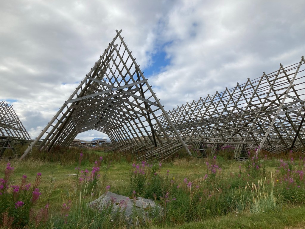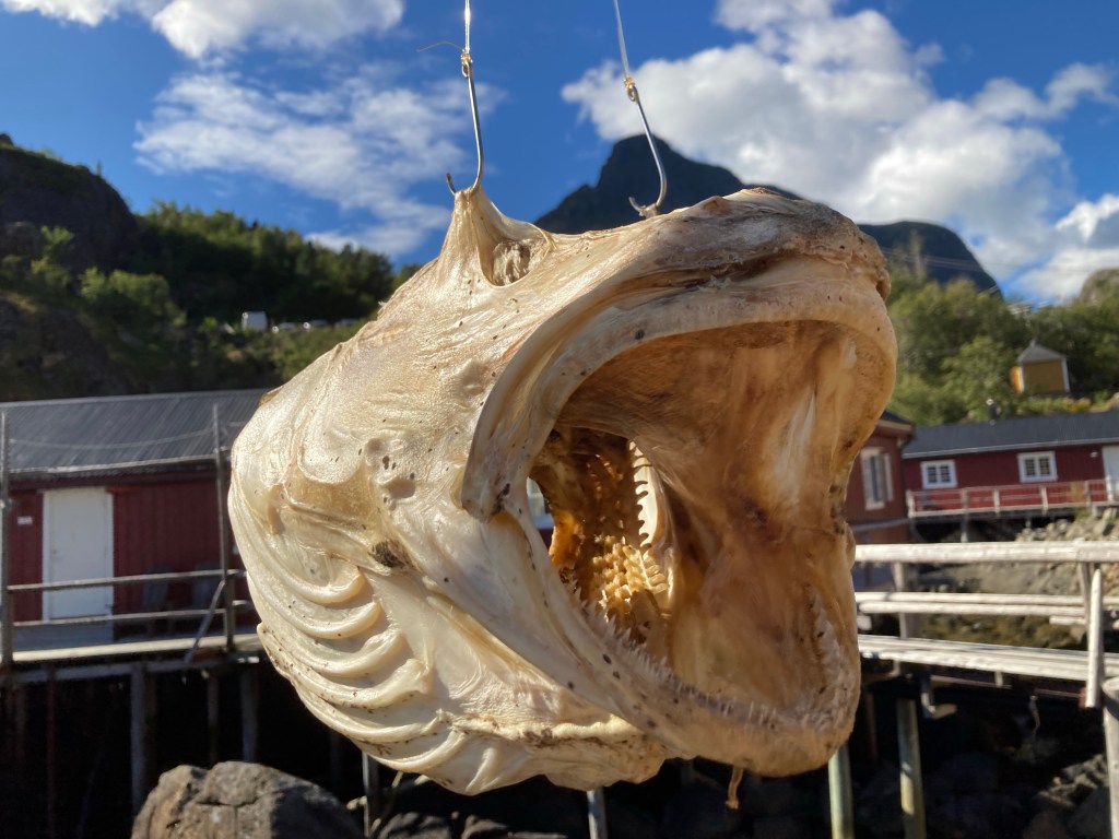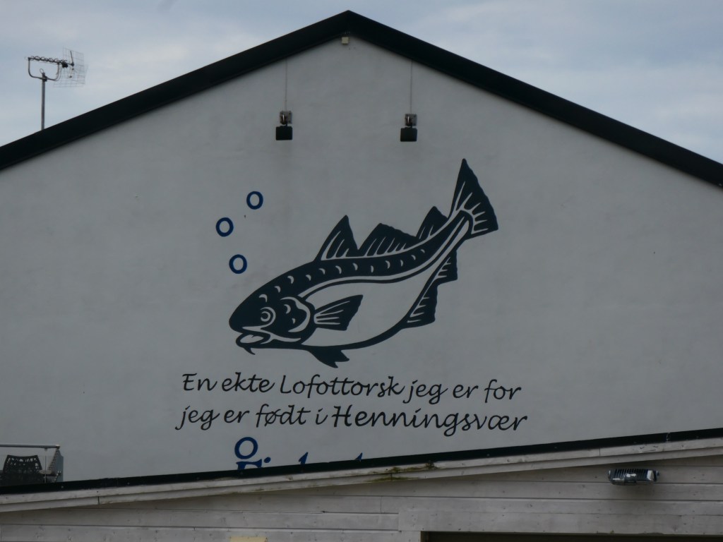 Car la mer de Norvège et le Vestfjord sont des lieux de profusion de morues, flétans entre autres. A foison on en pêche depuis des millénaires. Et on continue l’exploitation. L’hiver entre janvier et avril on étend les morues coupées en deux ficelées par la queue sur des étendoirs en plein air pour les saler et les faire sécher. C’est impressionnant car il n’y a pas un endroit aux iles Lofoten où il n’y a pas un étendoir même petit. Cela doit est incroyable de voir les pêcheurs poser ces morues sur des kilomètres. Ici la morue de l’Atlantique se nomme le Skrei, venue de la mer de Barentz pour frayer.