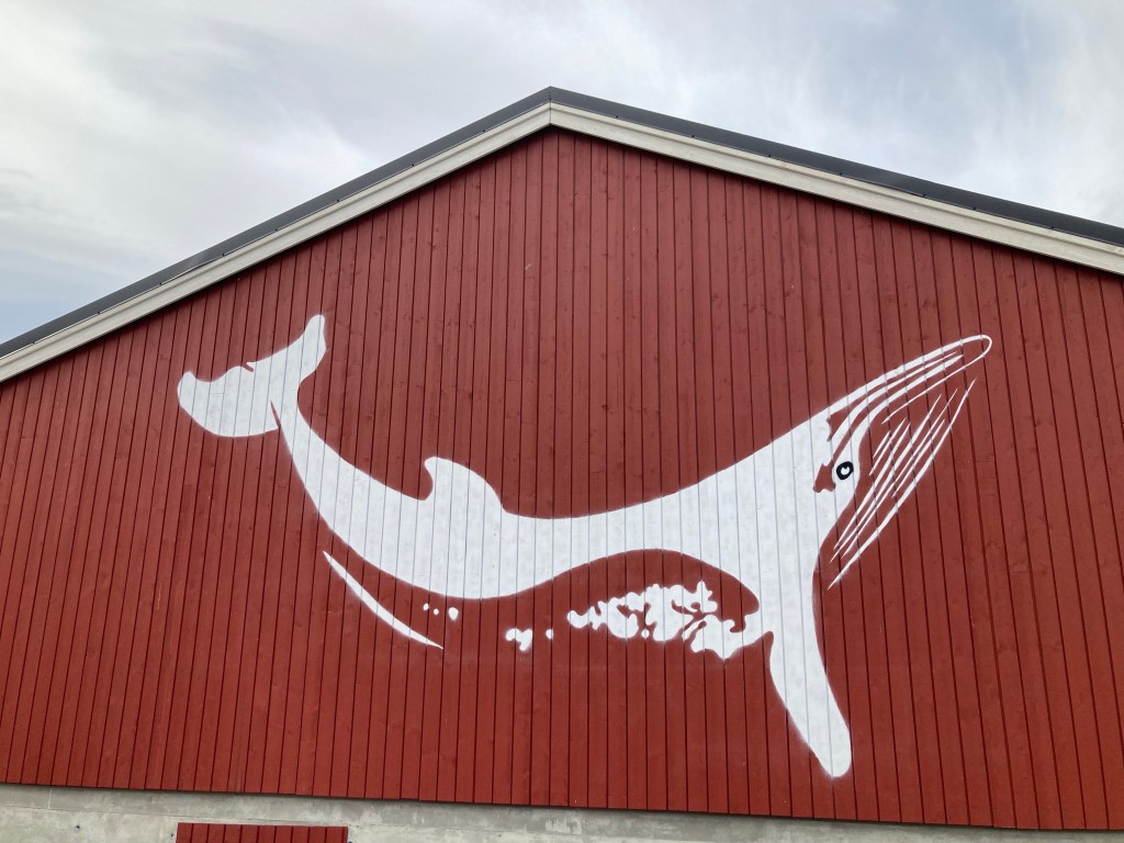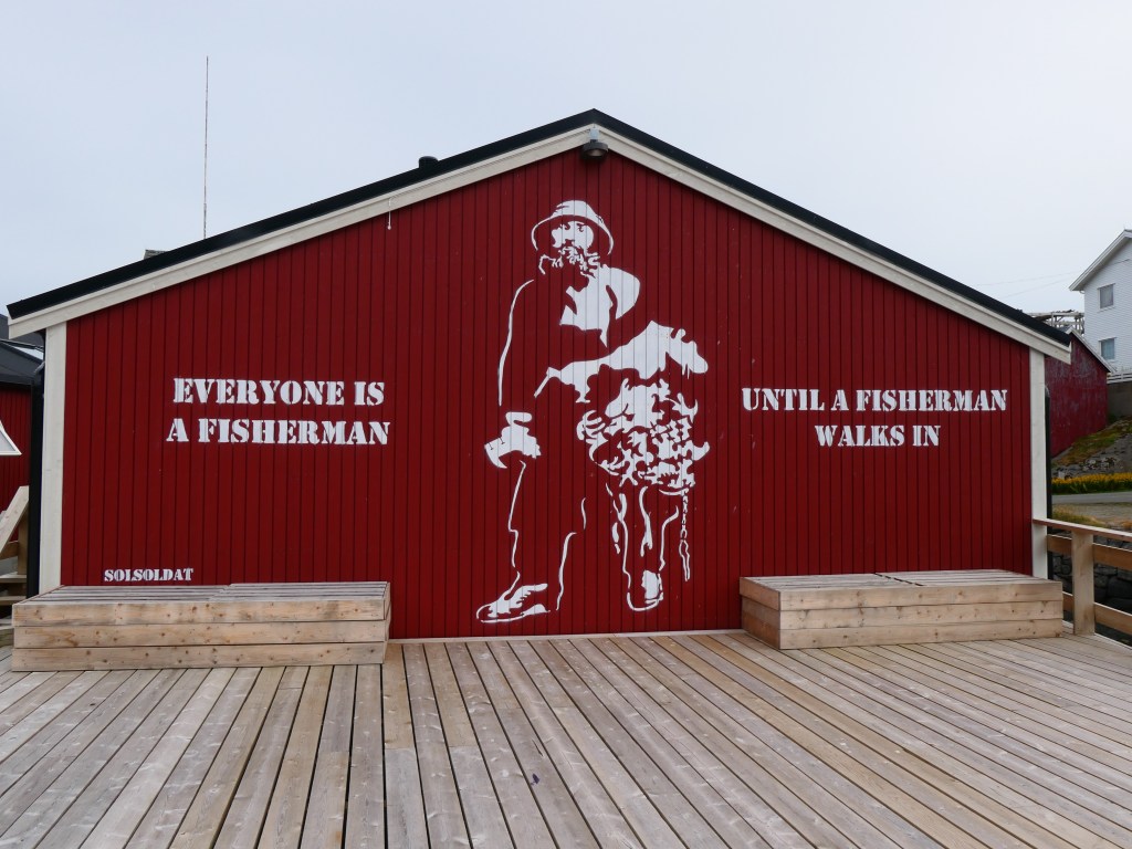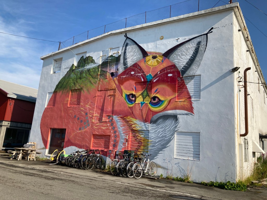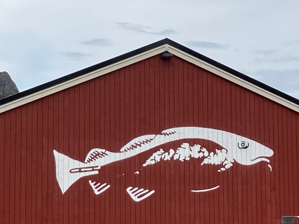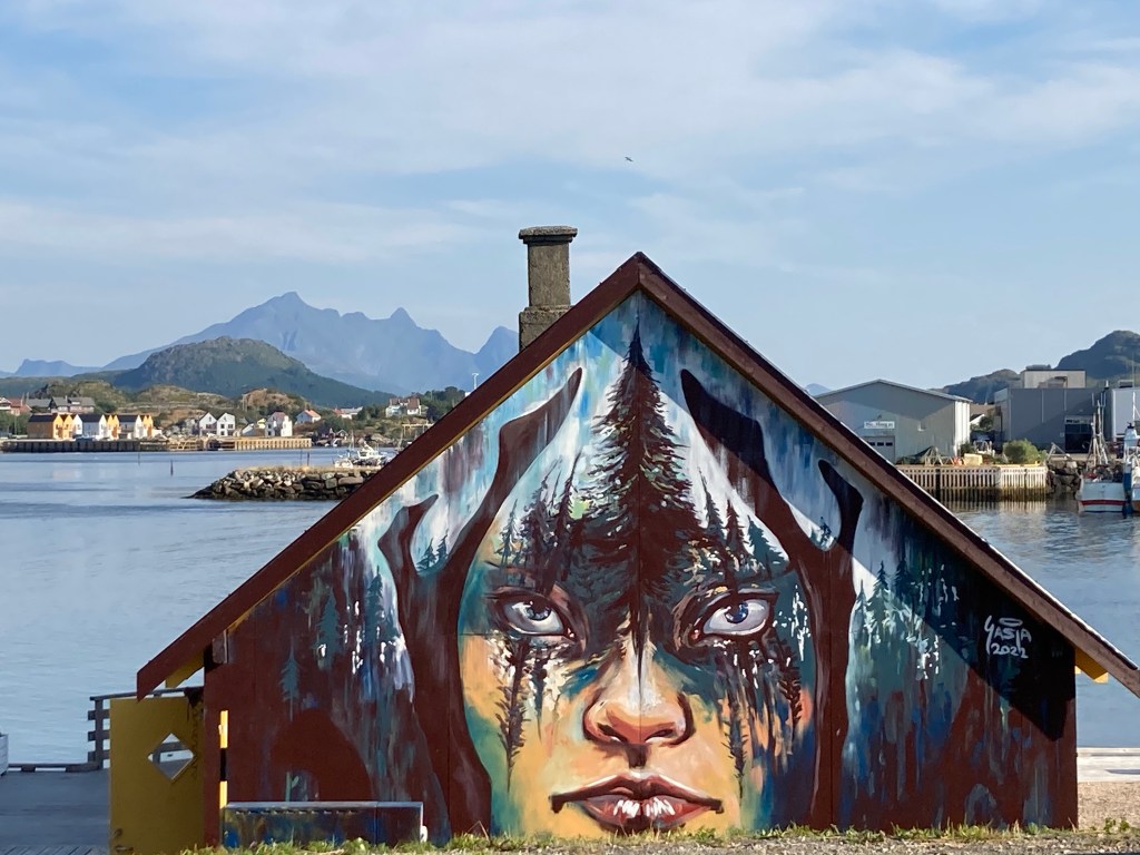 Et les lofoténiens ont de l’humour à revendre : A Kabelvag des skis qui forment une haie pour fermer un jardin ou bien une vieille cabine téléphonique qui est un dépôt de livres et qui trompe l’ahuri : des dessins sur les murs avec des aigles, des baleines ou bien des morues afin de bien s’imprégner de la culture des poissons et des cétacés. Et les chalutiers pour bien vous faire comprendre ce que c’est la dure vie des habitants de ces iles et on vous montre même à quoi ressemble un pêcheur. Il y a aussi de grandes fresques en particulier à Alstad où on peut voir un renard ou le visage d’une femme renne-loup avec un sapin au milieu du visage ; ou encore dans ce même port la fresque bleue représentant le port sur l’usine, de ses bateaux qui partent en mer ; et à la porte d’un rorbu cet homme orange pêcheur à la pipe et à côté de lui le laitier norvégien ! Ou bien ces chaussures pour marcher dans la neige qui trônent sur un mur.
