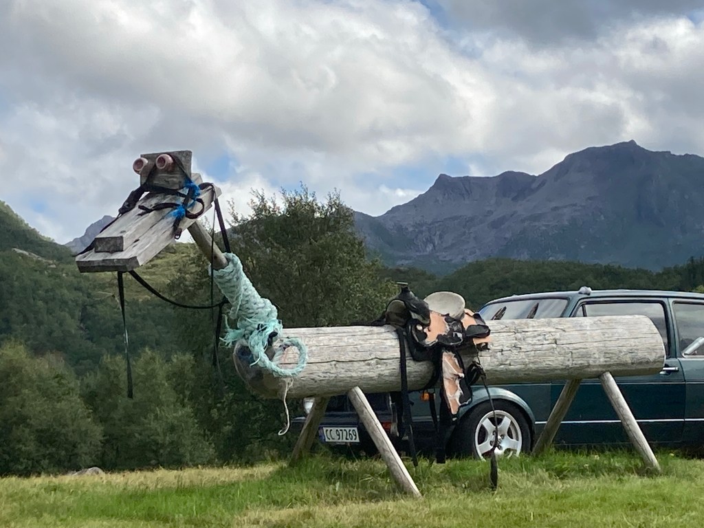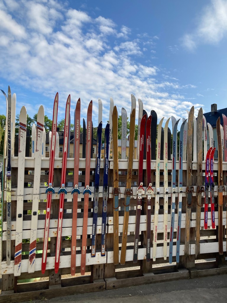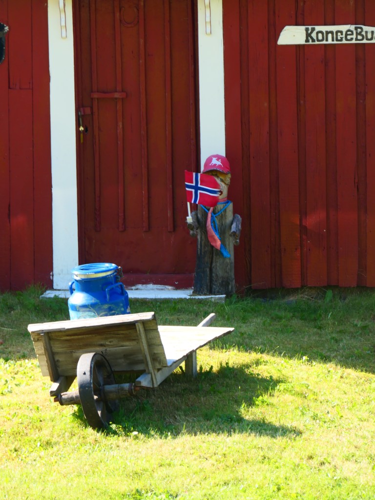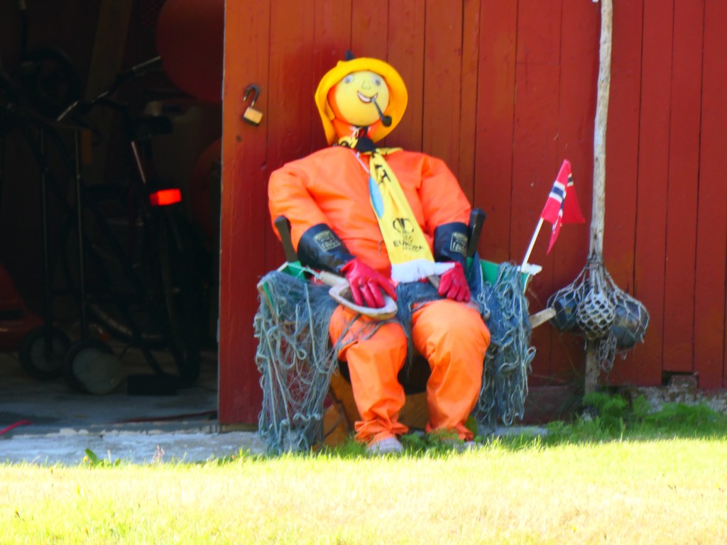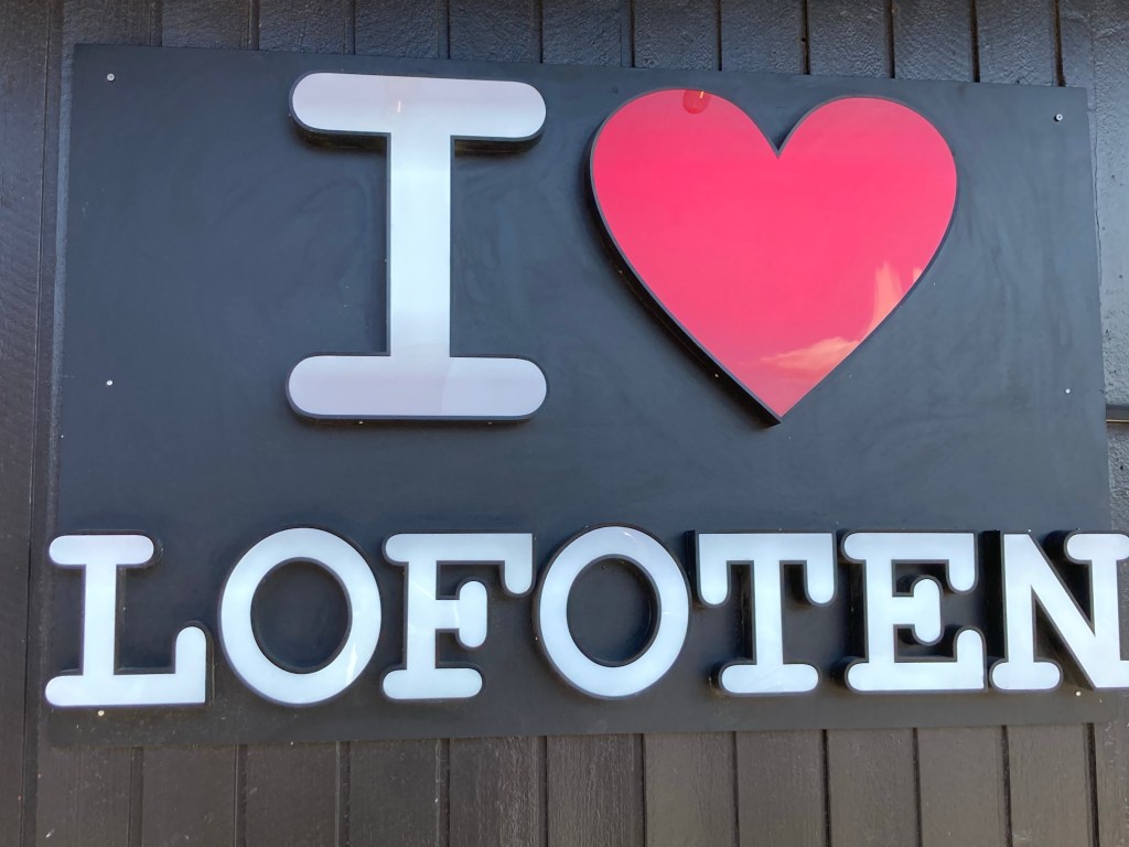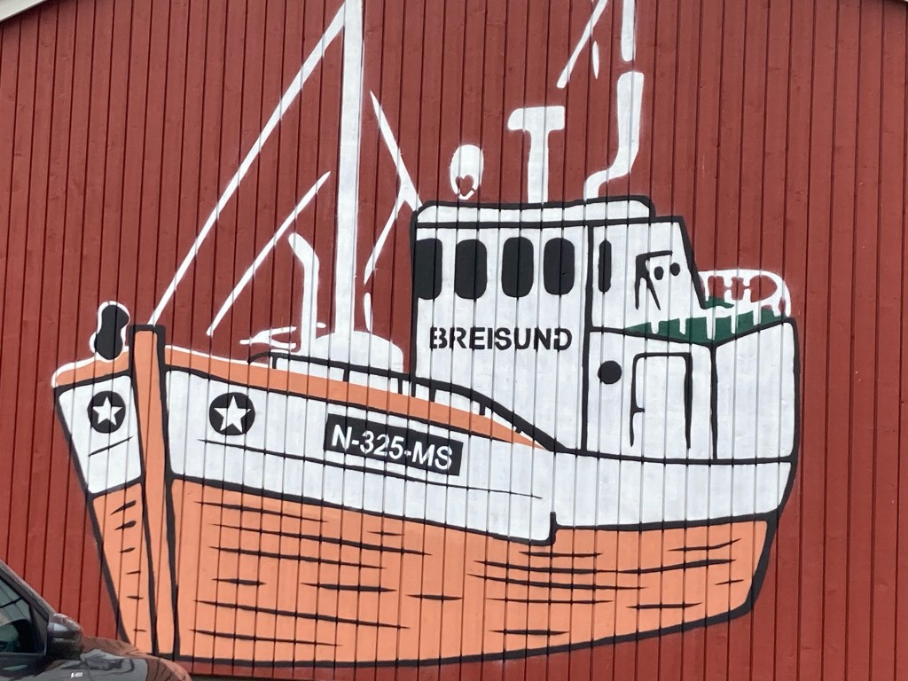 Et les lofoténiens ont de l’humour à revendre : A Kabelvag des skis qui forment une haie pour fermer un jardin ou bien une vieille cabine téléphonique qui est un dépôt de livres et qui trompe l’ahuri : des dessins sur les murs avec des aigles, des baleines ou bien des morues afin de bien s’imprégner de la culture des poissons et des cétacés. Et les chalutiers pour bien vous faire comprendre ce que c’est la dure vie des habitants de ces iles et on vous montre même à quoi ressemble un pêcheur. Il y a aussi de grandes fresques en particulier à Alstad où on peut voir un renard ou le visage d’une femme renne-loup avec un sapin au milieu du visage ; ou encore dans ce même port la fresque bleue représentant le port sur l’usine, de ses bateaux qui partent en mer ; et à la porte d’un rorbu cet homme orange pêcheur à la pipe et à côté de lui le laitier norvégien ! Ou bien ces chaussures pour marcher dans la neige qui trônent sur un mur.