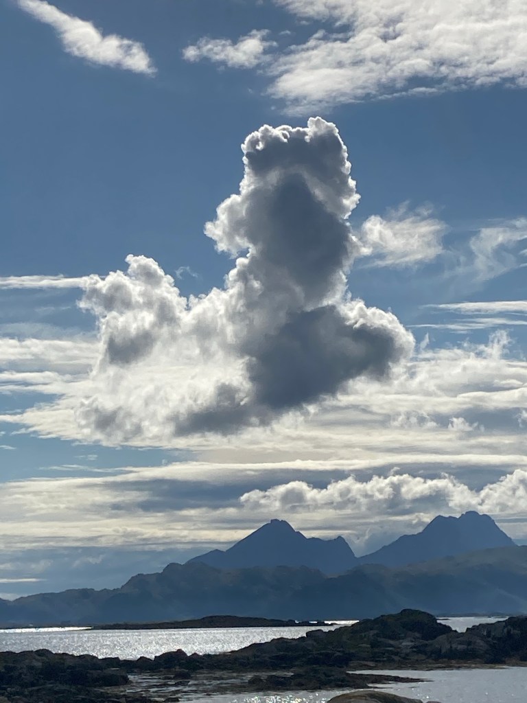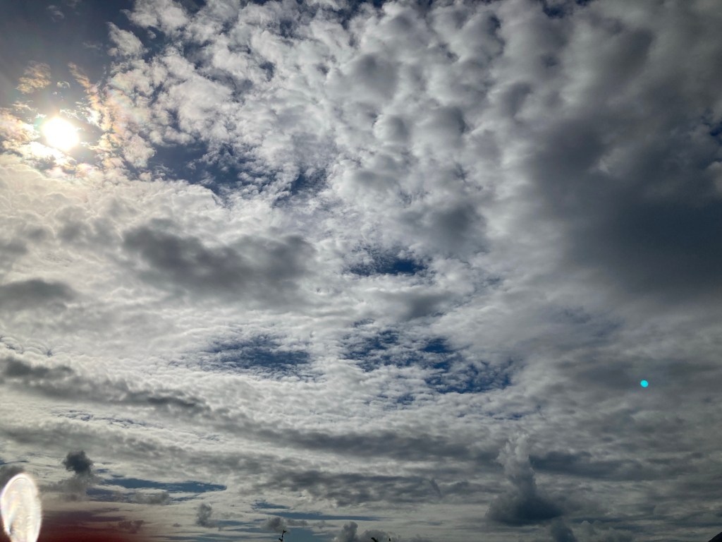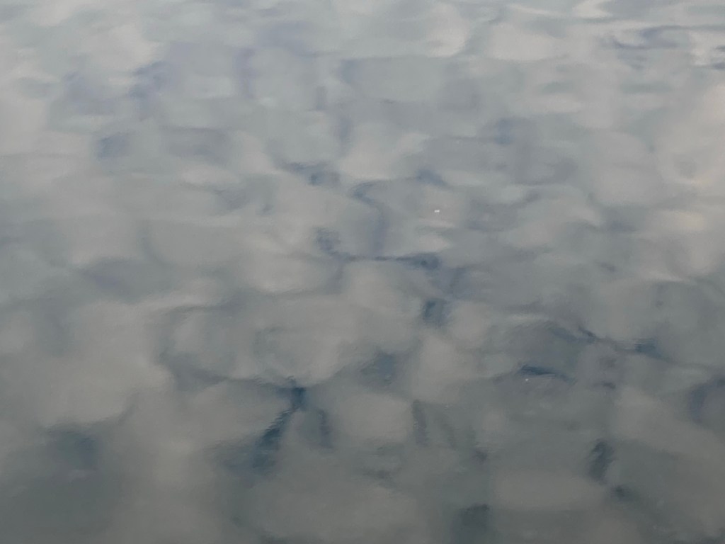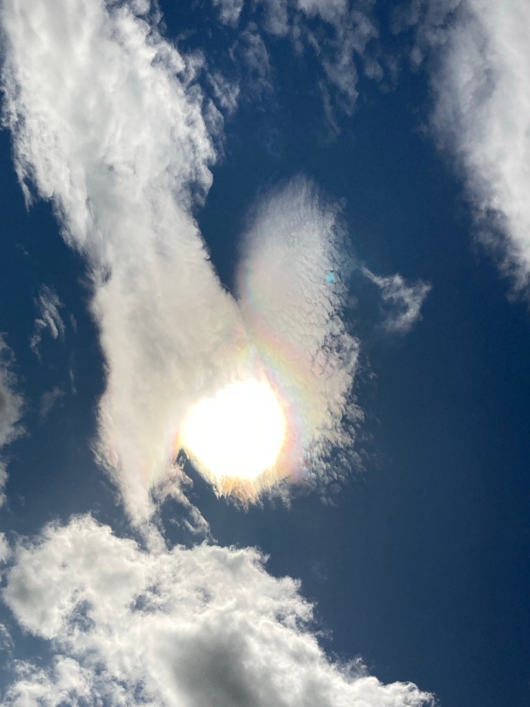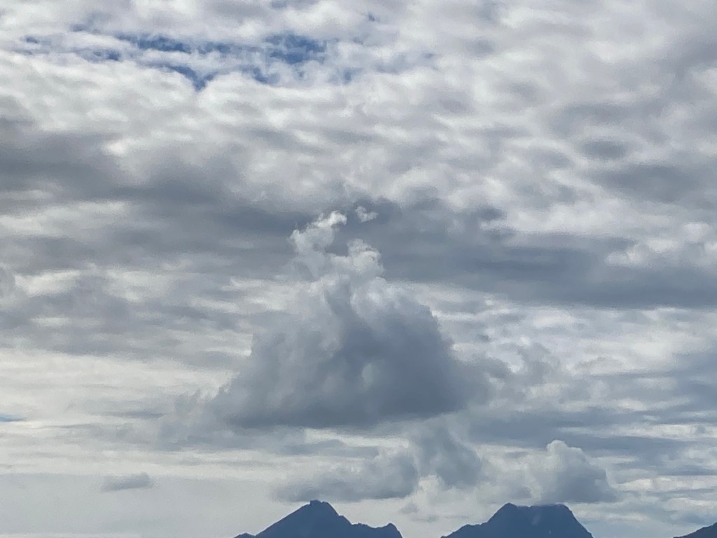 Les nuages aussi se jouent de nous et font des défilés qui changent leurs configurations : des grands traits comme réalisés avec des pinceaux chinois avec le soleil à l’intérieur qui illumine le tout ; ceux qui font des trainées de gros cumulus blancs qui disparaissent au fur et à mesure ; ceux qui font des boules de coton qui se reflètent dans la mer et finissent par représenter des gros glaçons qui voguent sur l’eau ; ceux qui créent des monts d’où jaillissent deux cœurs ; et celui qui ressemble à un chien volant.