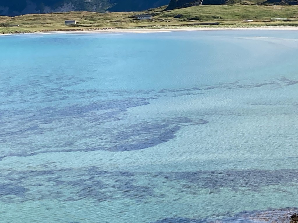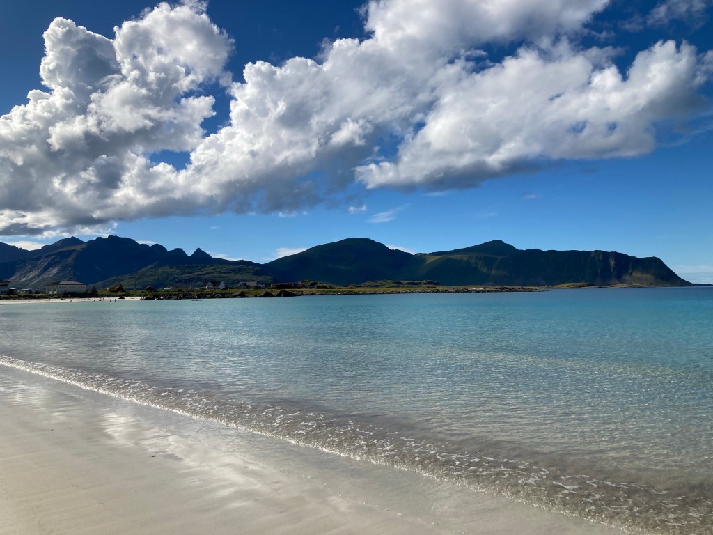 Cela évoque aussi en été ses plages extraordinaires au sable blond blanc, comme celle de Ramberg ou bien des toutes petites comme celle d’avant la pointe d’Eggum ; les couleurs bleutées – turquoise de la mer, à se pâmer d’extase avec travers les différents tons – évoquant les Caraïbes hélas sans la chaleur de l’eau ;