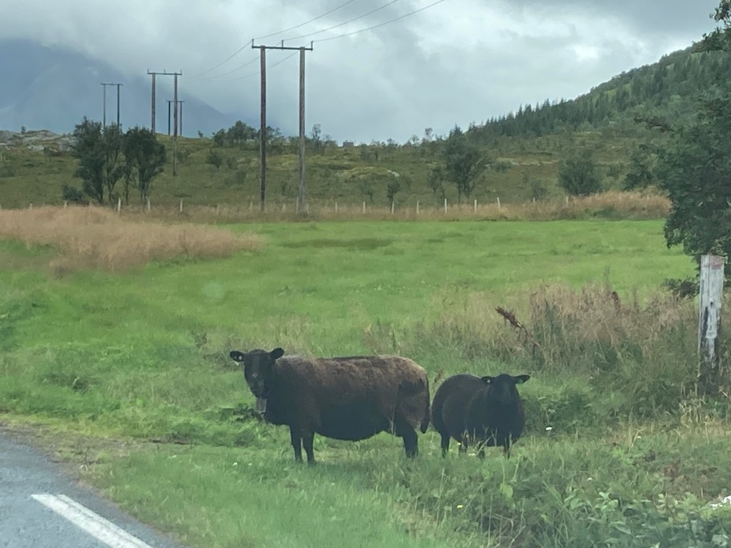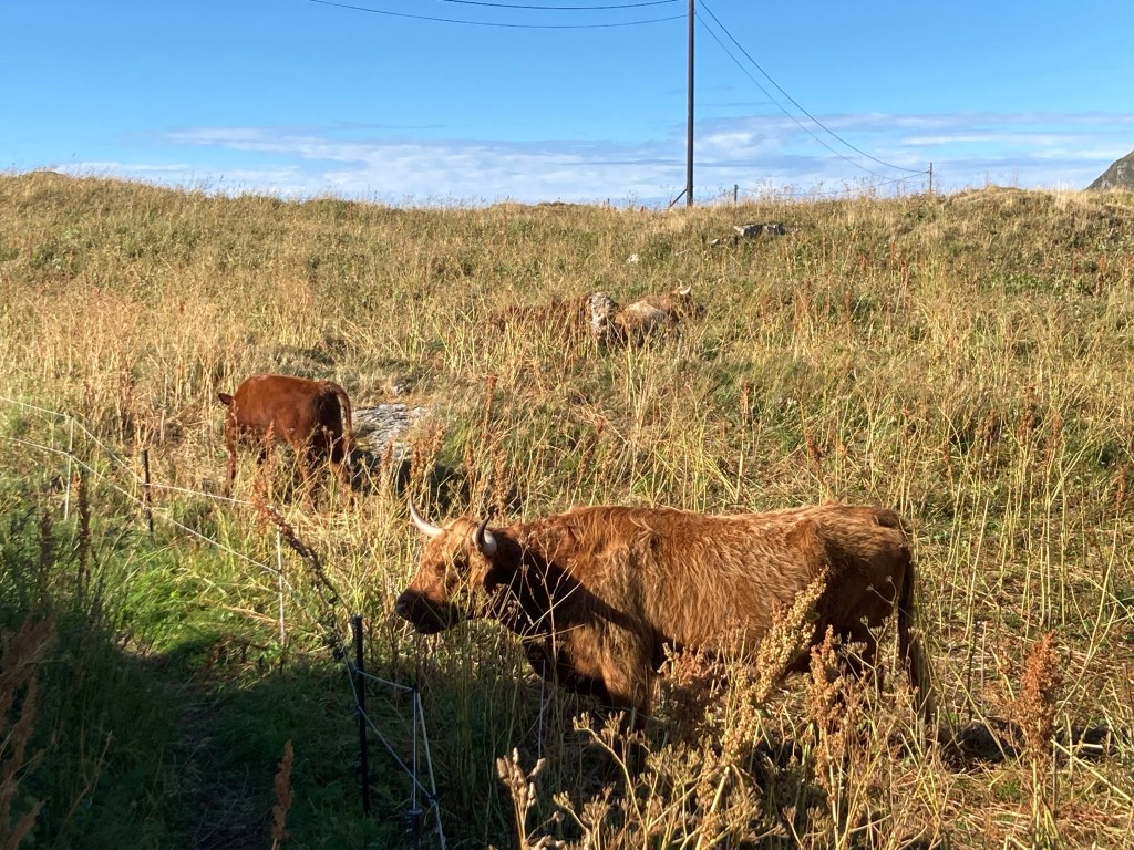Et puis il y a les moutons blancs ou noirs qui broutent les herbes des prés et des champs ; ou bien qui traversent la route se moquant du quidam et des voitures qui passent. Il parait que c’est délicieux le « lamb » mais je n’ai pas réussi à m’en procurer ou à en déguster un morceau dans un restaurant. L’été cela ne doit pas exister ! Juste à regarder sur la route ! Et puis les vaches marrons aux cornes aiguisées qui se reposent dans les herbes hautes jaunies.