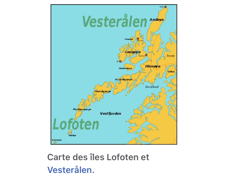 Tout d’abord les iles Lofoten se trouvent dans le nord de la Norvège, en mer de Norvège, bien au-dessus du cercle polaire, en face de Bodo, séparées par le Vestfjord du continent. (68e parallèle). Là il va vous falloir trouver une globe pour situer !