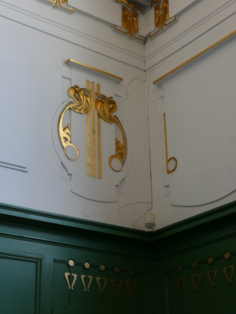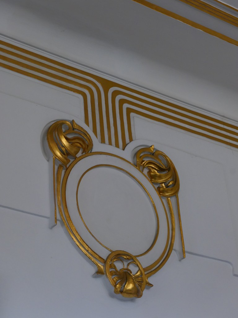 Lorsque l’on entre dans le musée on est face à l’accueil et une horloge nous fait face avec autour des tiges dorées qui finissent en formes de fleurs. Le plafond est stylisé lui aussi de longues tiges dorées avec à chaque bout des ailes d’anges qui pourraient représenter des bougeoirs avec la flamme de la bougie.
